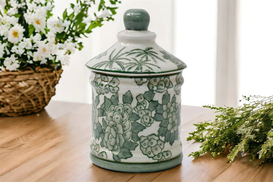 Ceramic Green Parrot Palm Willow Urn Jar With Lid 16cm