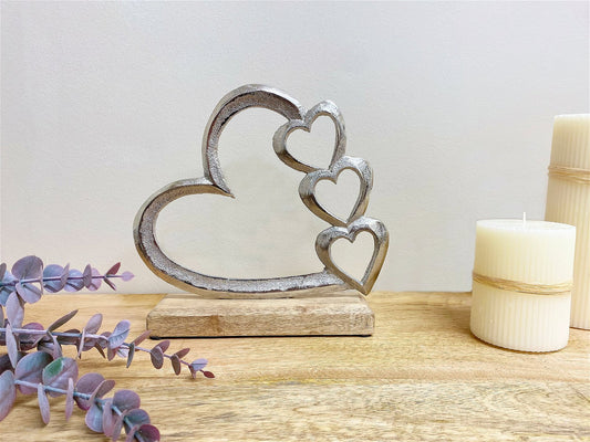 Metal Silver Four Heart Ornament On A Wooden Base Small