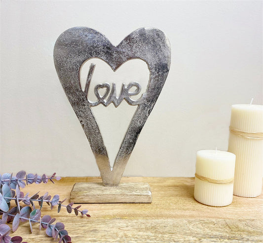 Metal Silver Heart Love On A Wooden Base Large