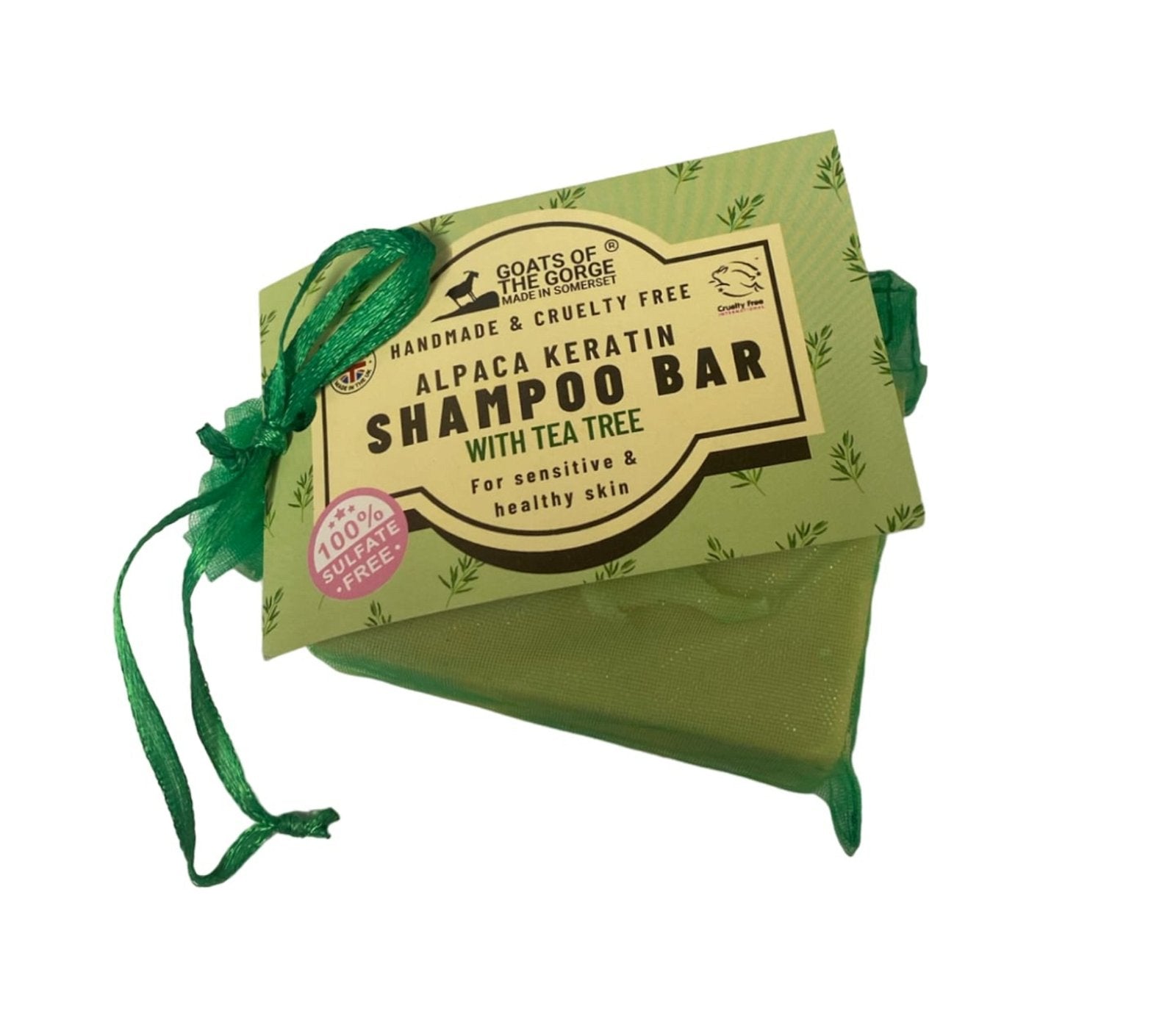 Goats of The Gorge have worked closely with the Cadbury Alpaca farm in Clevedon to create this shampoo bar, formulated with only the best natural ingredients. The extracted Keratin from the Alpaca fleece is an essential protein for skin and hair protection alongside strength. As well as being super beneficial to our hair, this shampoo bar is environmentally friendly, helping to reduce plastic waste. 100% sulfate free, contains Keratin, Coconut Oil, Olive Oil, Shea Butter, Castor Oil and Tea Tree Essential Oil. Packed in a silk organza bag. Goats of the Gorge are proud to be Leaping Bunny approved. All of their own brand cosmetic and personal care products are approved under the Cruelty Free International Leaping Bunny programme. Measurements: D2 x H5 x W7cm