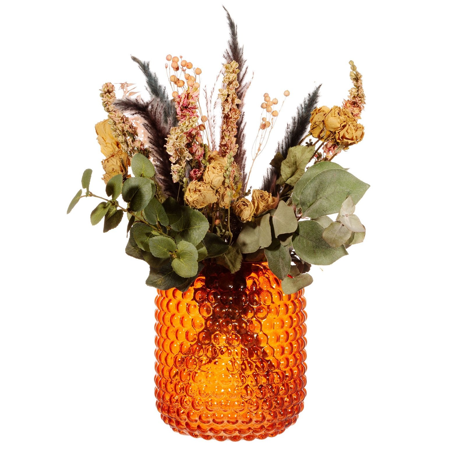 Inspired by the popular bohemian trend, designed for inside the home, this vase is perfect for displaying fresh or dried flowers. Made from glass to create a bobble design, featuring a colourway of amber. Measurements: D16 x H20 x W16cm