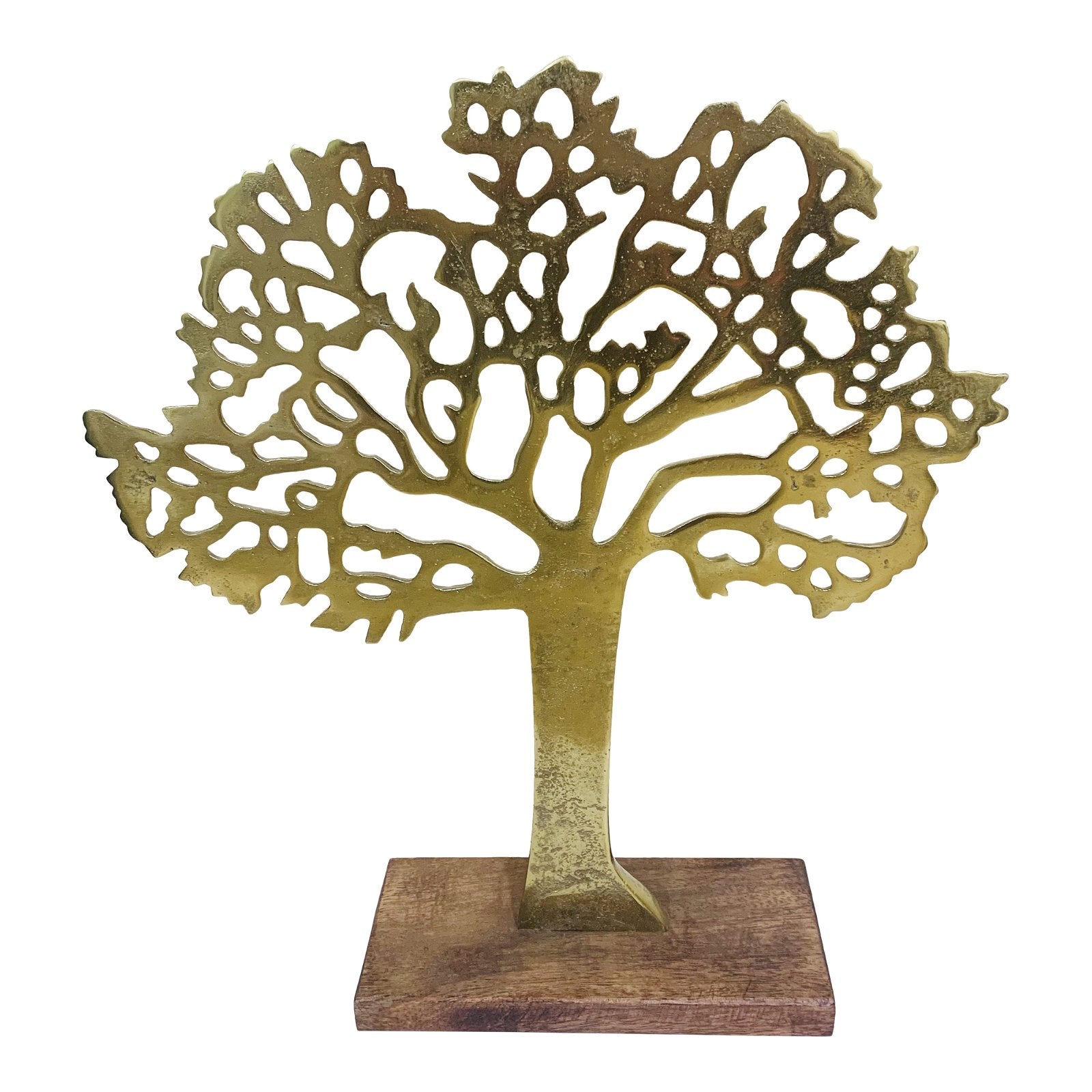 Tree of life themed metal gold tree on a wooden base. It is an attractive natural piece which would enhance any rooms decor. Has an antique gold finish with the tree part measuring 25x23x0.5cm and the wooden base is 7.5x15x2cm. Overall measurements are: D7.8 x H27 x W23cm SKU: OR1613