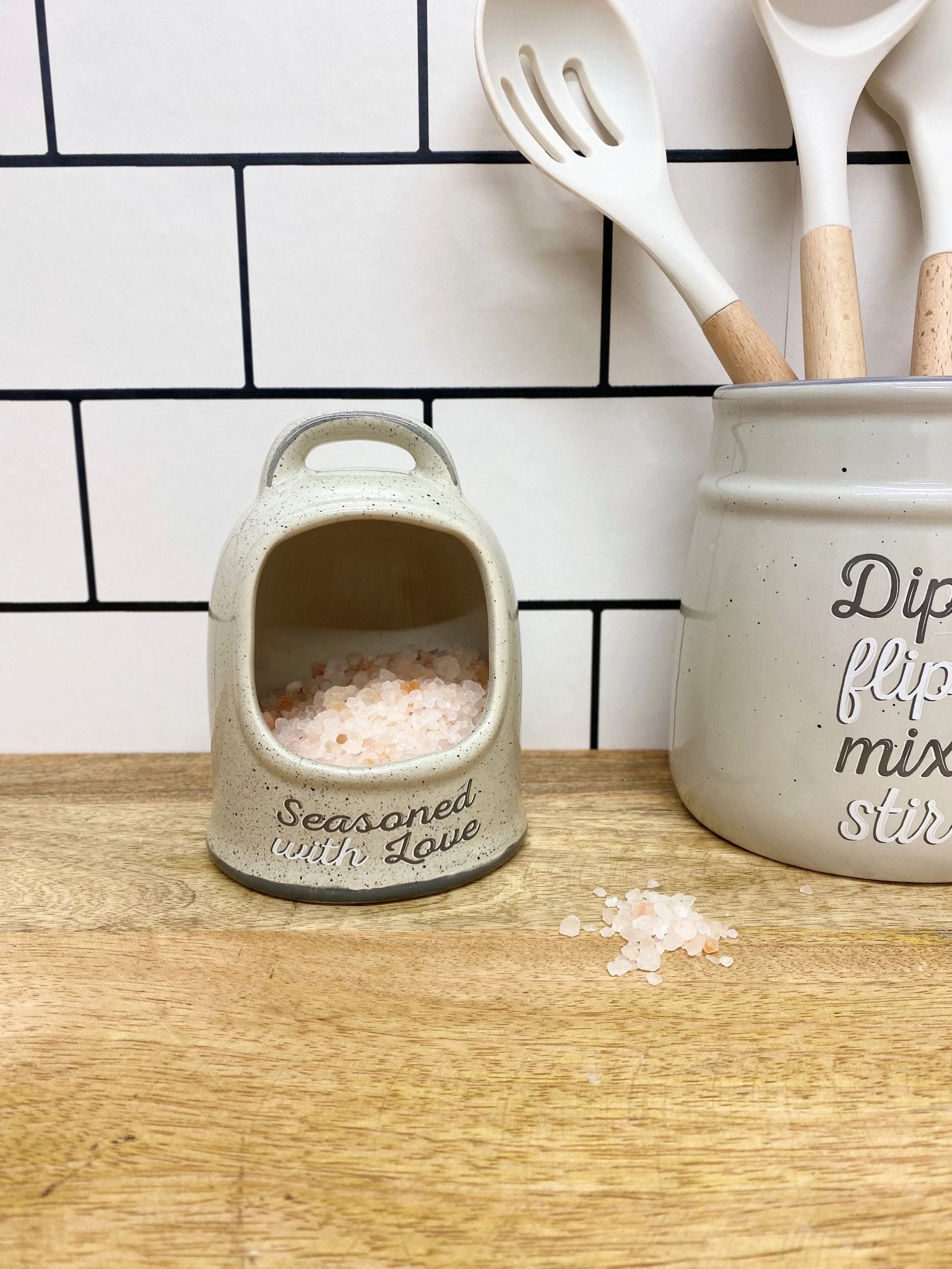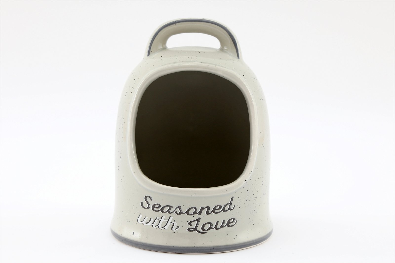 An antique grey glazed ceramic salt pig, with the words 'Seasoned With Love' on the front. A practical and convenient way to store salt. A part of the Antique Grey collection. Measurements: D10 x H14 x W10cm