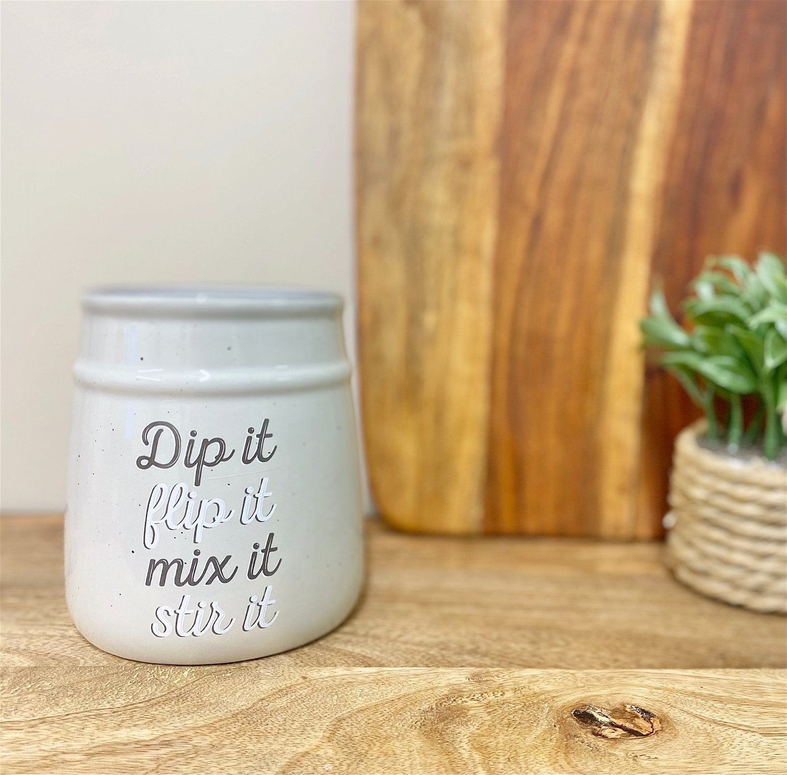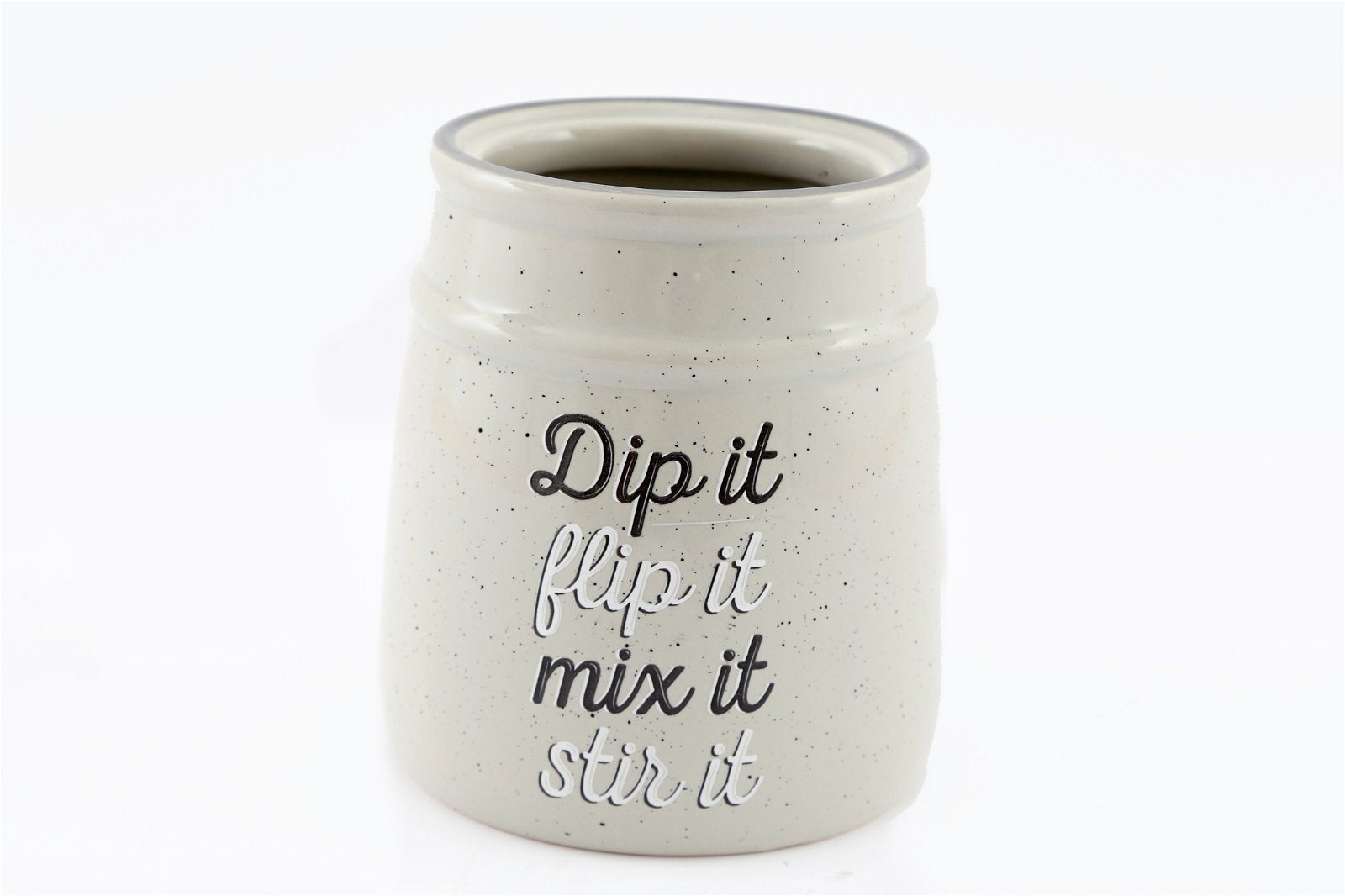 A glazed ceramic utensil holder is stylishly inscripted and edged in a subtle grey. A chic and practical holder that would flatter any kitchen area. Measurements: D12 x H14 x W12cm SKU: KG0965