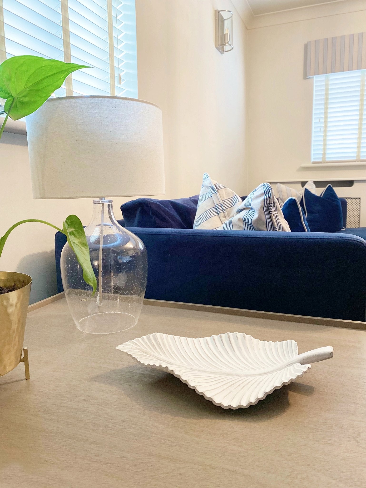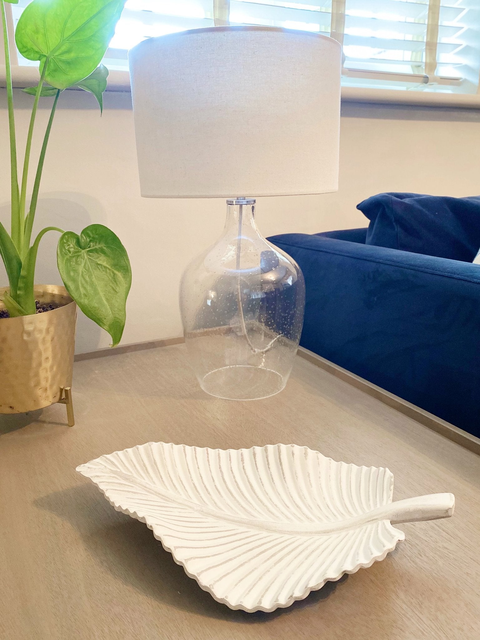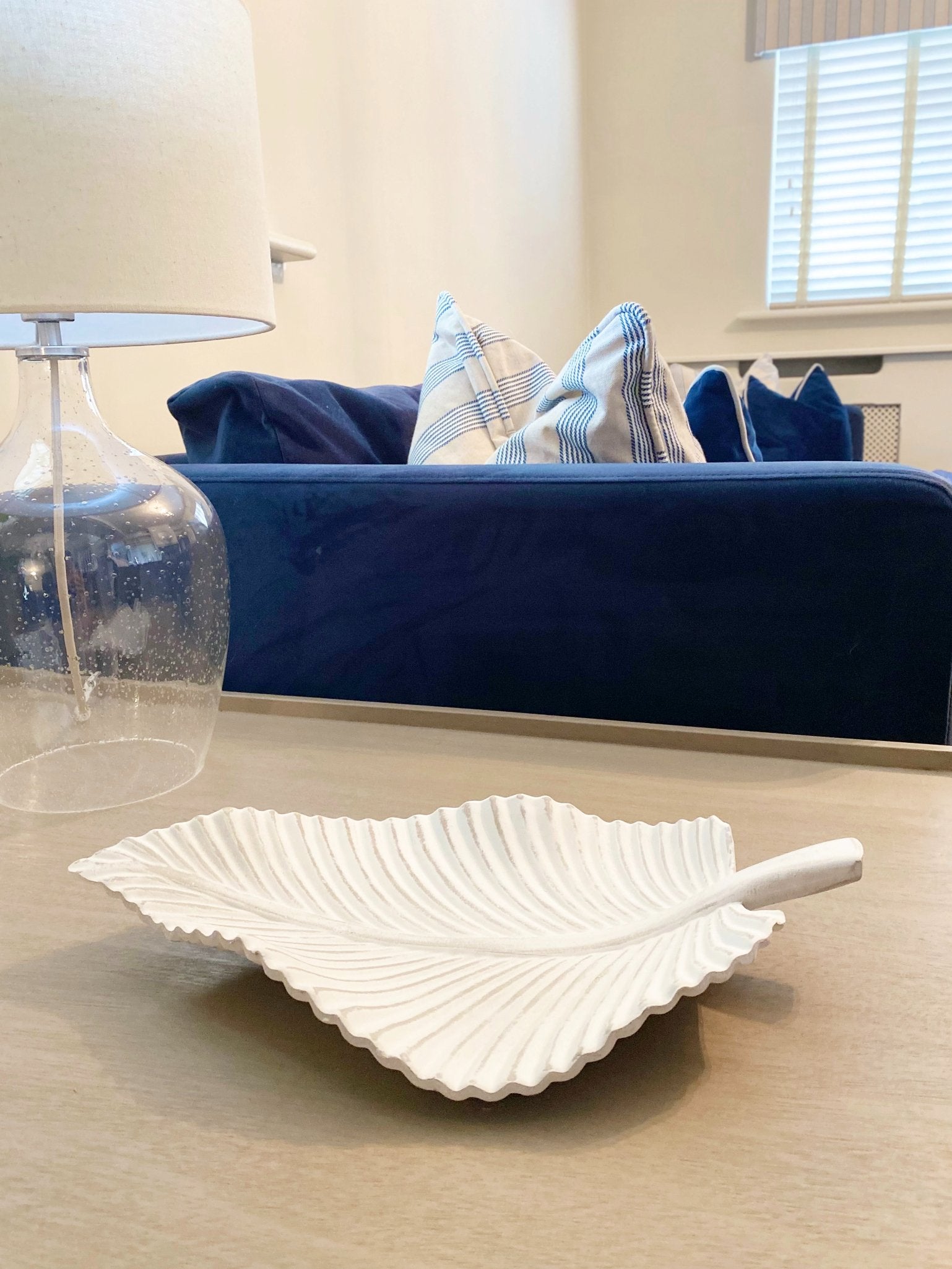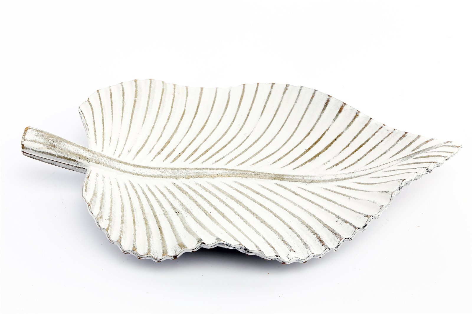 A white washed leaf-shaped dish with a distressed finish, ideal for storing trinkets. Perfect for a rustic styled home. Measurements: D20 x H2 x W35cm