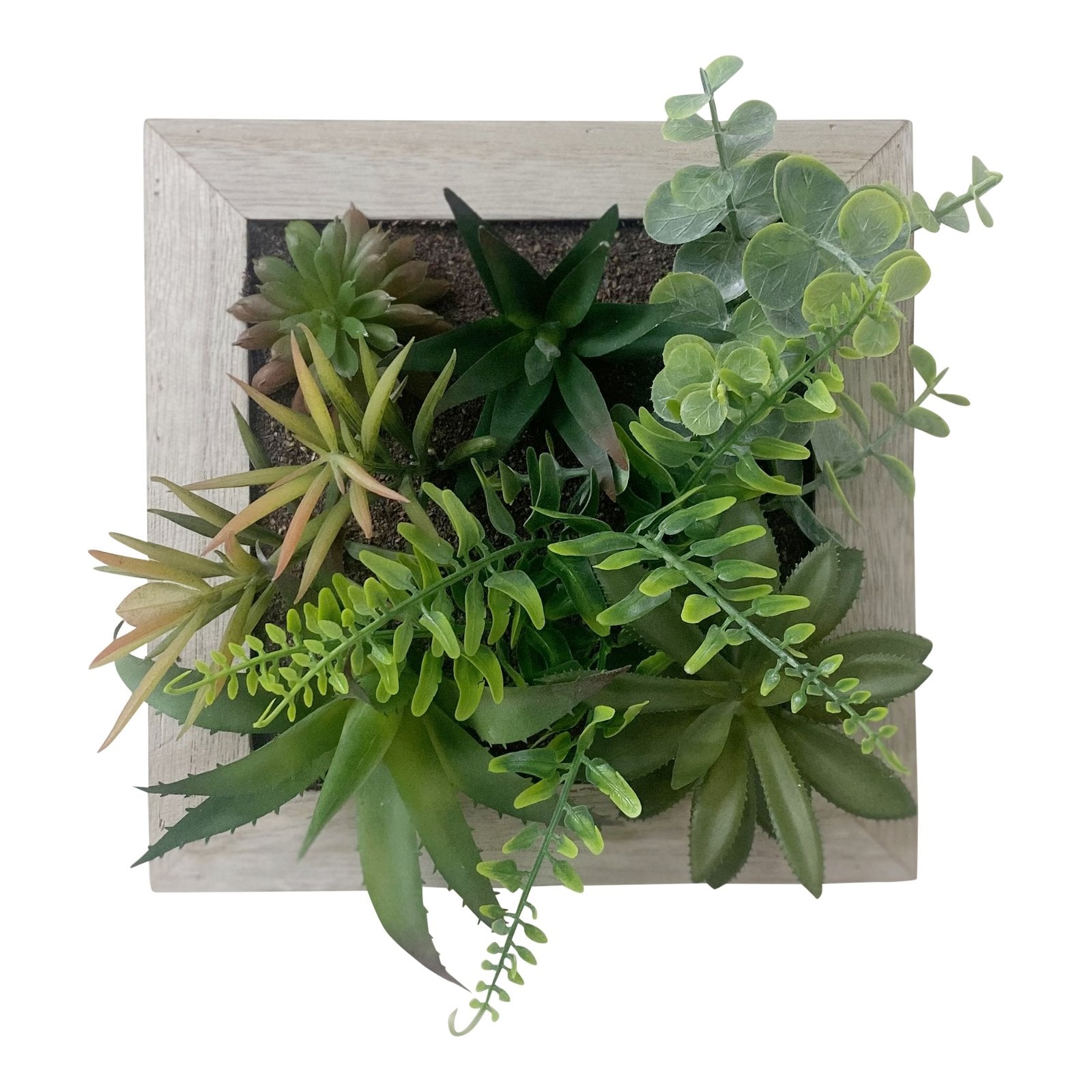 A square wooden box containing various artificial succulents. The box is designed to appear as a garden border with the delicate succulents planted. Random pick. Box measurements: D20 x H5 x W20cm. Box border W2.5cm SKU: FL1252