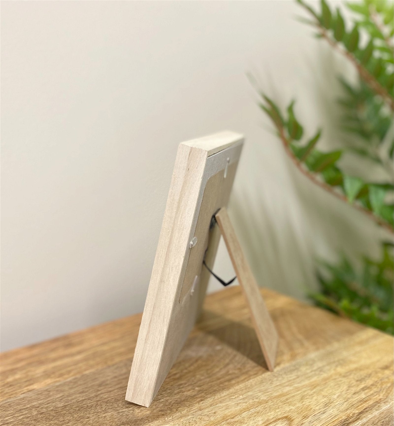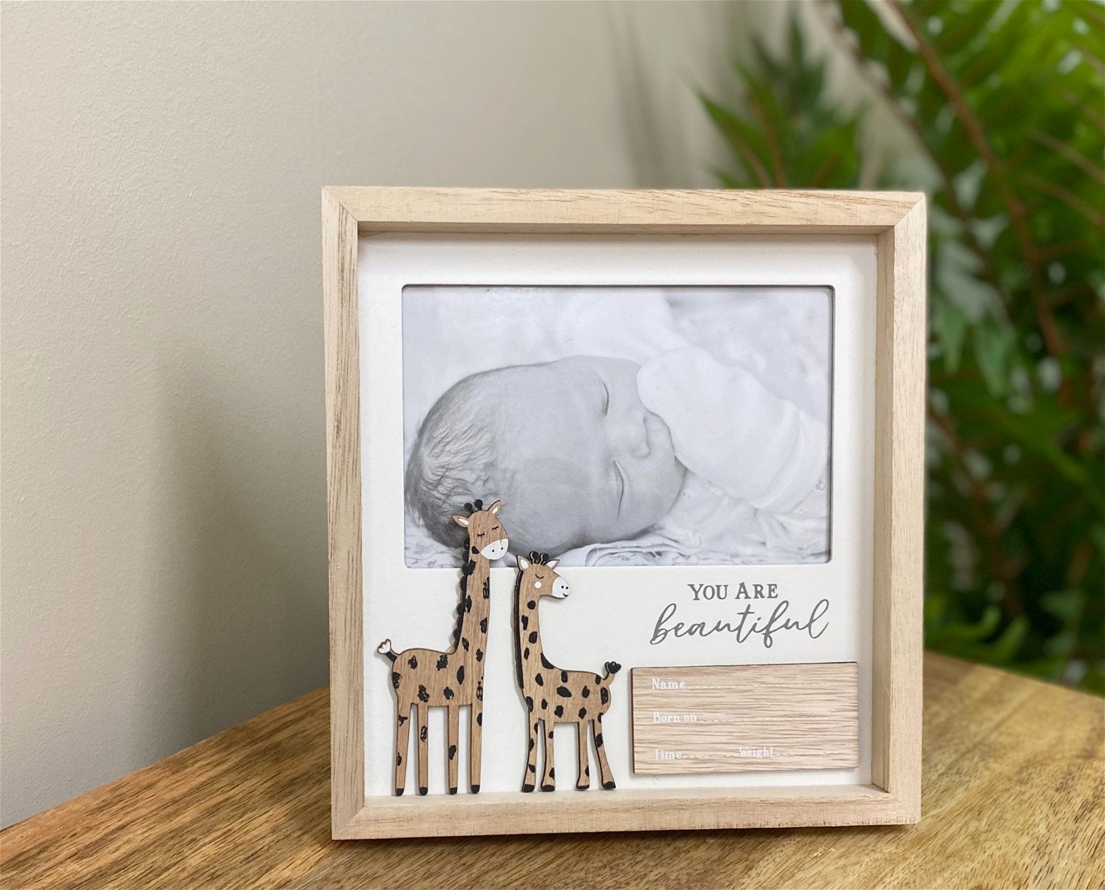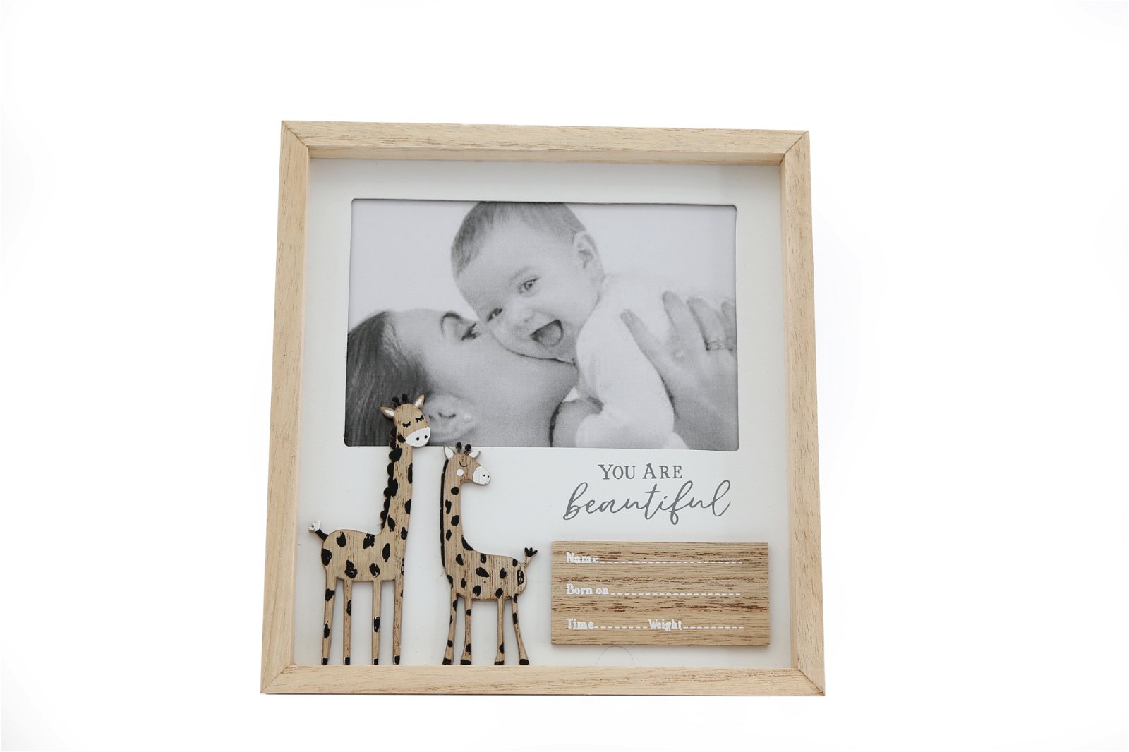 A wooden free standing frame, part of the Safari Range, with space for one photo 9 x 14 cm. The natural wood frame 20 x 19 cm has a cream mount with 3D cut out images of safari animals, entitled ‘You are beautiful’ with an additional detail plaque. This cute item would be a lovely addition to any child's bedroom or nursery. Measurements: D2 x H20 x W19cm SKU: BB0401
