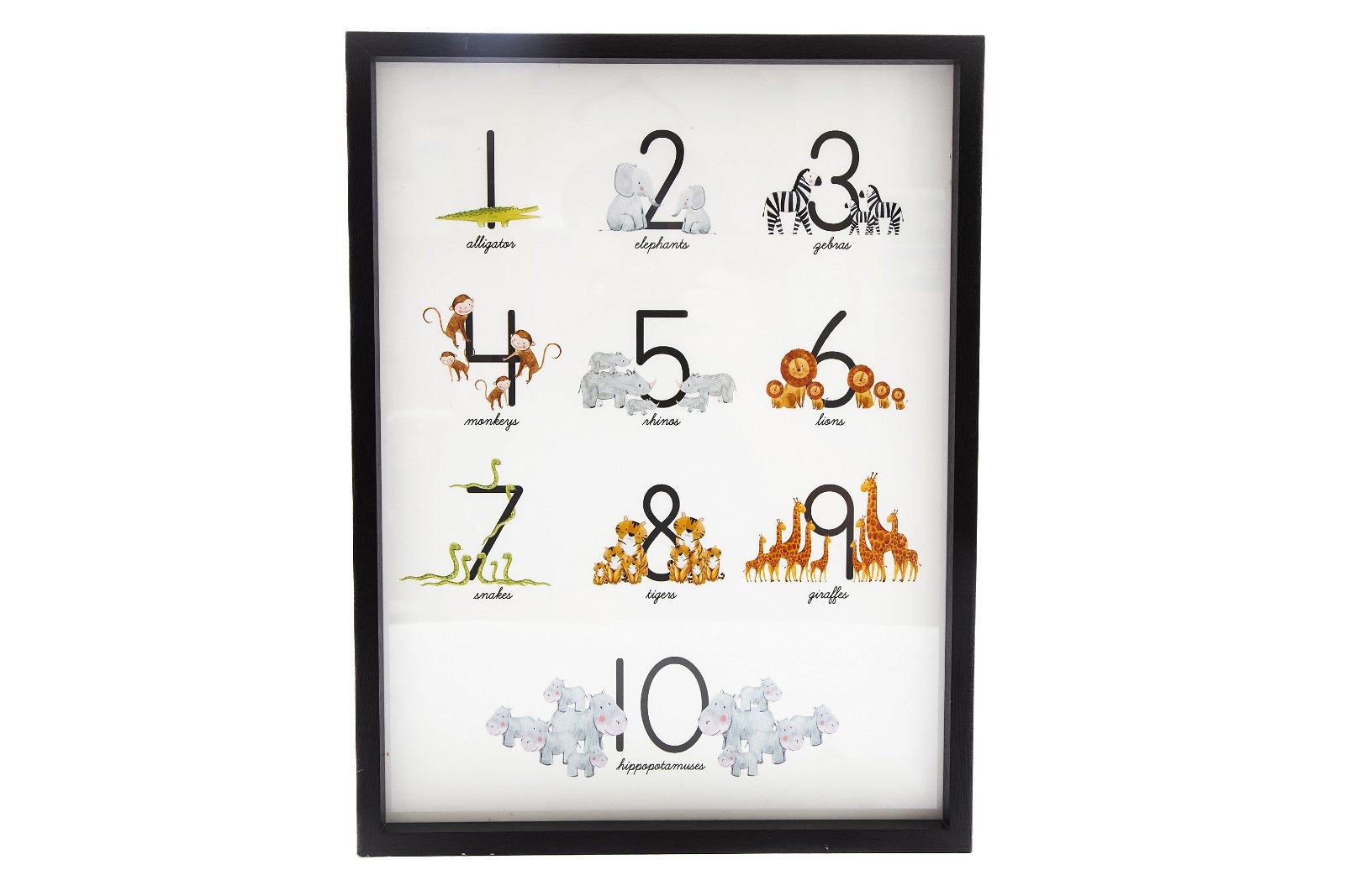 A numerical print showing 1-10 decorated with colourful animals. An attractive print that is also a visual learning tool for a child. Black wooden frame, numbers 1-10 with animal drawings of that number. Portrait wall hanging, with the letters measuring 5cm height and 4.5cm width. Overall measurements are: D2.5 x H41.5 x W31.5cm SKU: BB0363