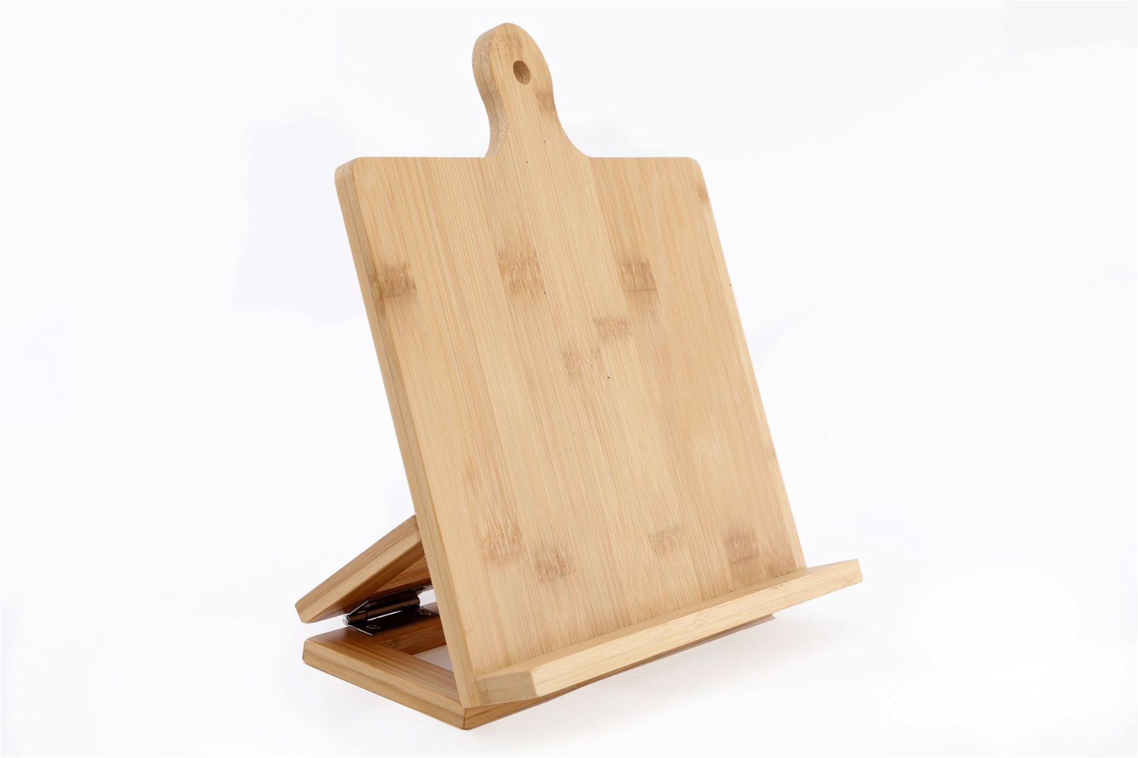 A natural bamboo wood holder is supported by two hinged brackets forming an A frame rest. The smooth solid surface rests at 45 degrees with a small lip to rest the book upon. Smooth clean lines and it simple quality allows this to be compliment any kitchen design. The book area is 21cm wide, 23.5 cm high. The resting lip is 2cm deep. Overall measurements: D5 x H26 x W21cm SKU: KG1056