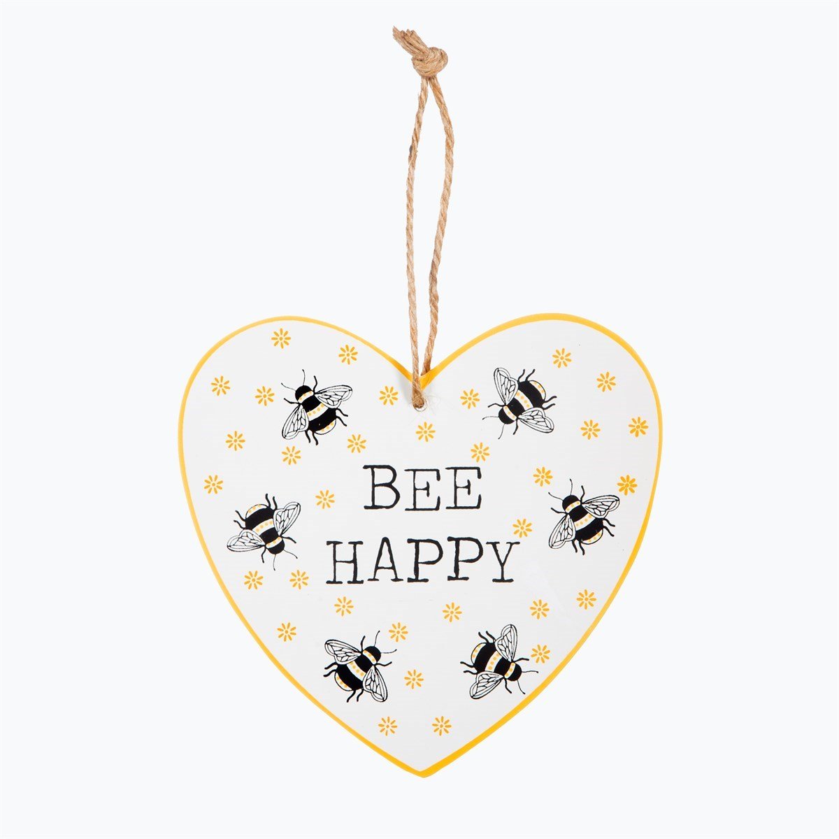 Sometimes, a wooden heart plaque can say it best. Hung with jute, this decoration is made from white painted wood and features the quote 'bee happy' in a beautiful black typography Complete with our buzzing bee design and details of honey yellow. Measurements: D12.8 x H0.6 x W13cm