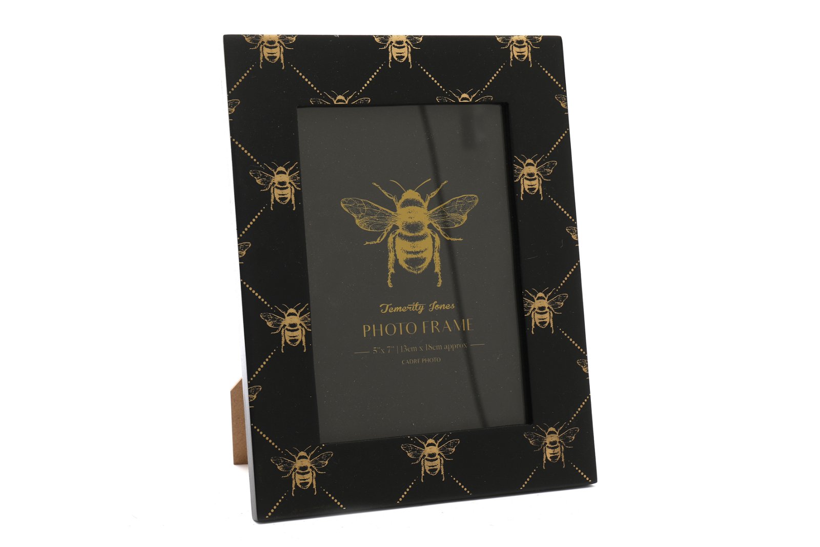 This black and gold bee designed photo frame would be perfect as a gift as the simple colours will compliment any home while the intricate design brings elegance to the frame. Black free-standing MDF frame with gold bee designs. The frame width is 3.5cm and holds a 5x7” photo. The total measurements are: D1 x H23.5 x W18.5cm SKU: TJBE29