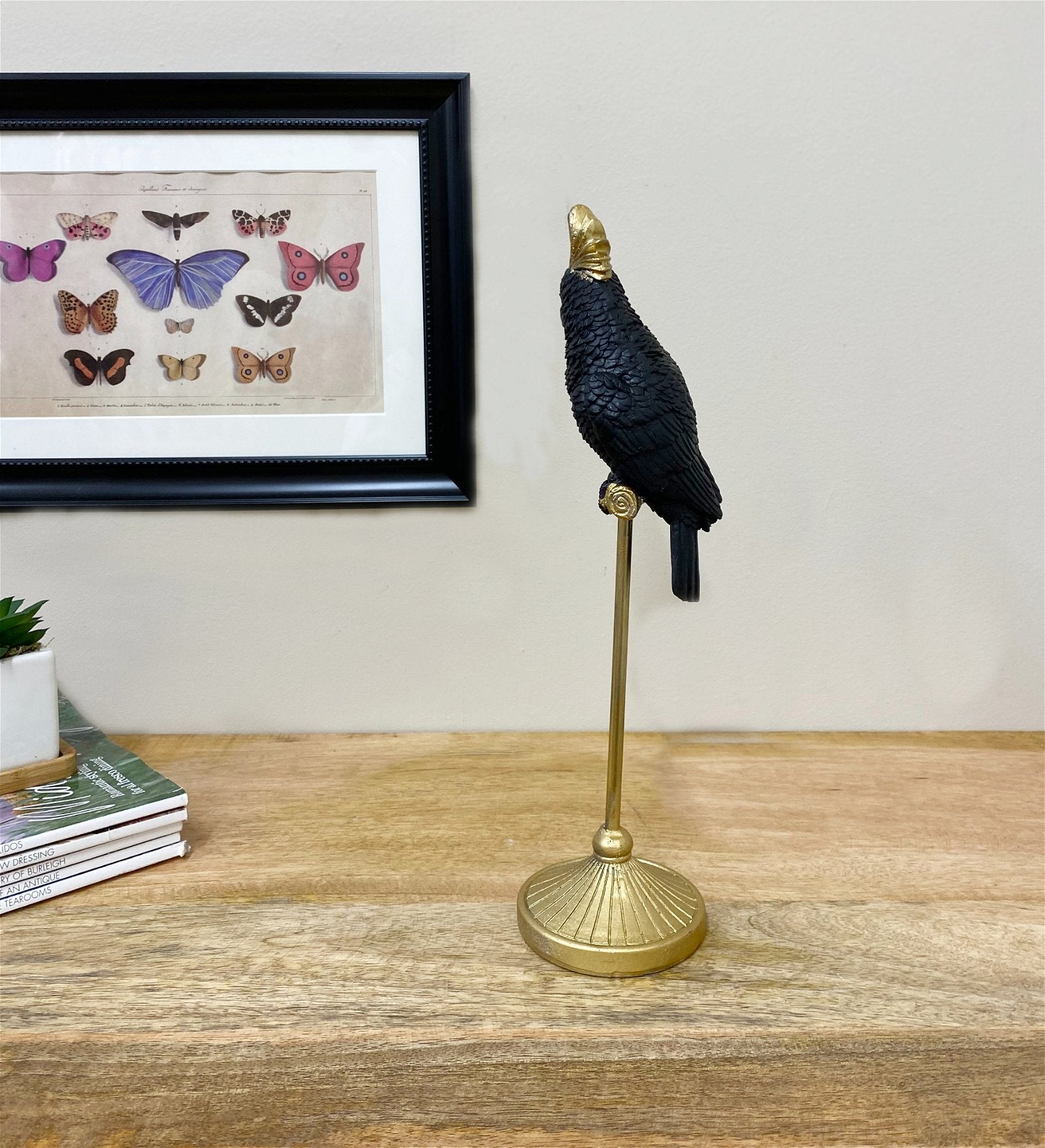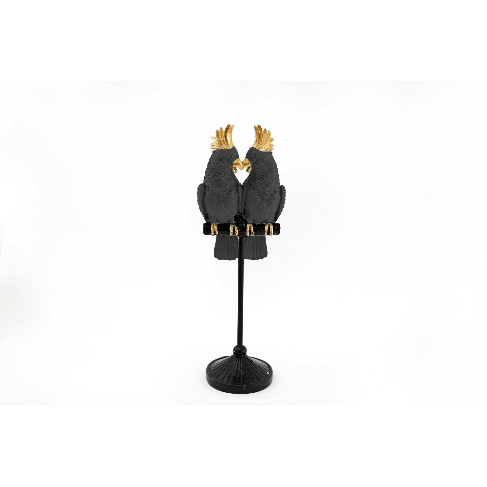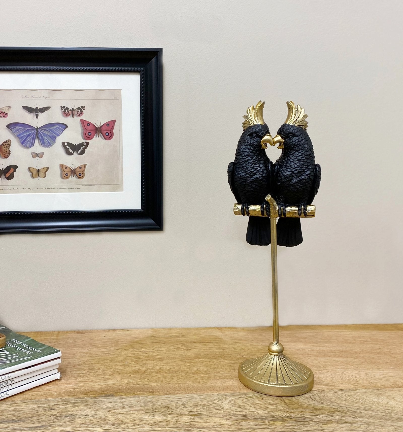 Detailed pair of black and gold cockatoo birds on a gold coloured perch. These elegant pair would grace any home decor. The birds are W10cm x H18cm x D7cm. Base diameter is 8cm and the perch spindle is 14cm tall. Measurements: D8 x H29.5 x W9.5cm