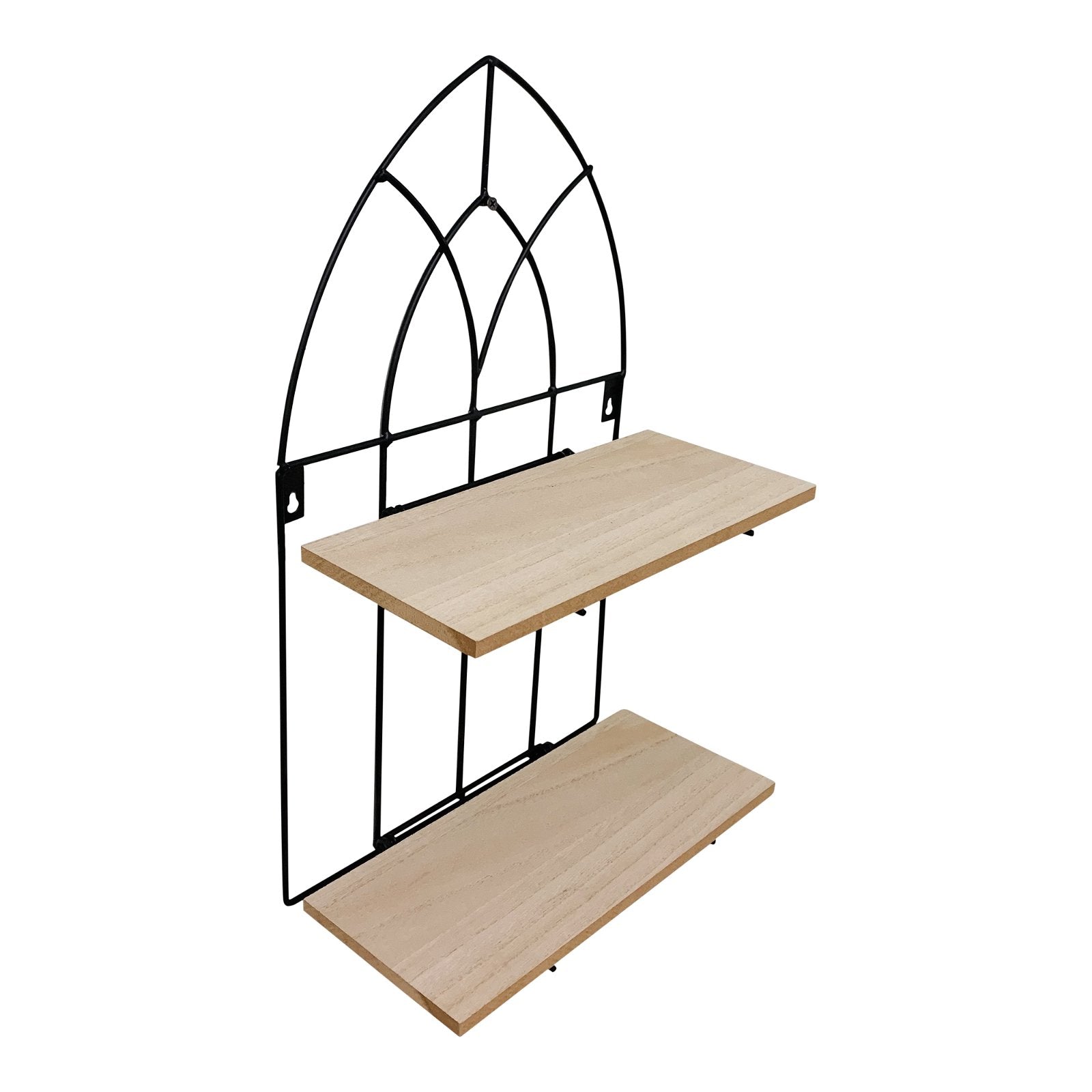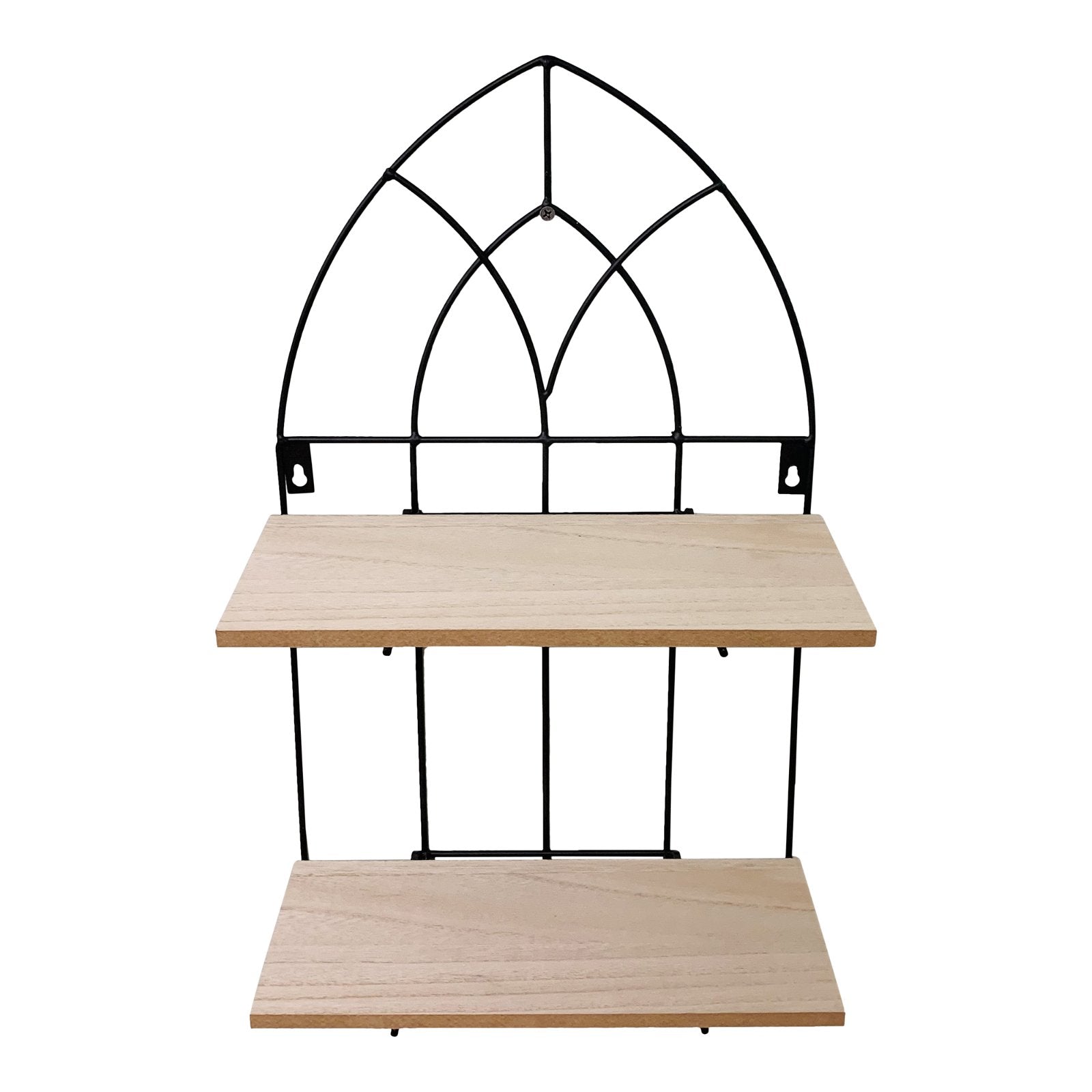 This elegant themed shelving unit will add a rustic feel to any room for decoration or storage. Metal arch style frame with two MDF folding down shelves 20 cm apart. The shelf dimensions are 30x13x1cm and from the top shelf to point of arch is 24cm. The overall measurements are: D15.3 x H48 x W30cm SKU: WF2523