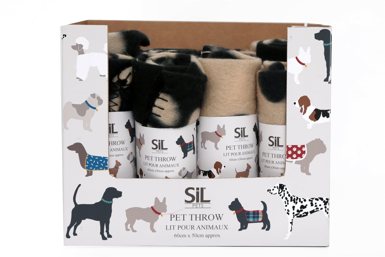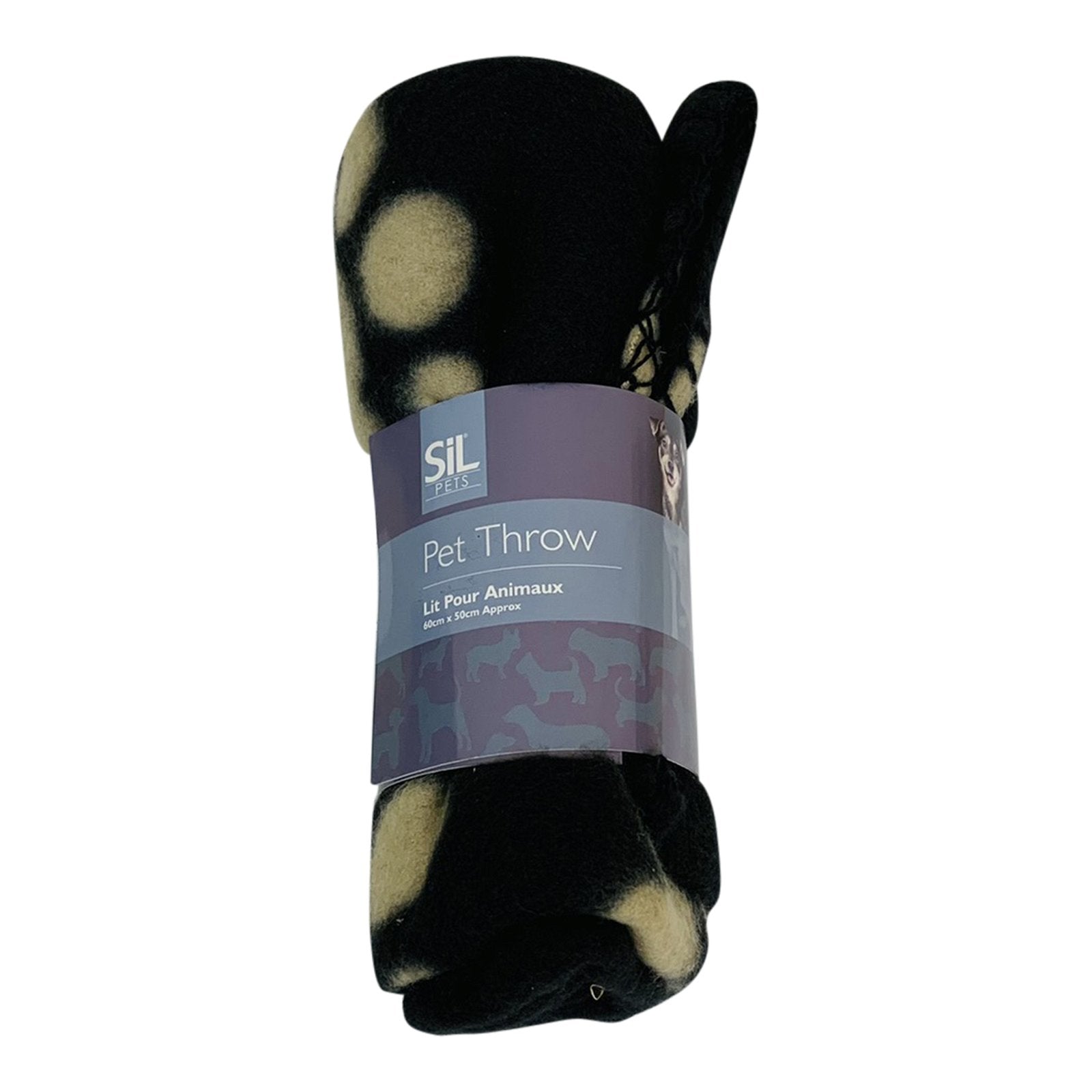 This black fleece pet throw with brown paw prints would be perfect for any four legged friend to give them a soft place to lay, hide, and snuggle. Black fleece pet throw with brown paw print. Measurements: 60 x 50cm SKU: PE0835A