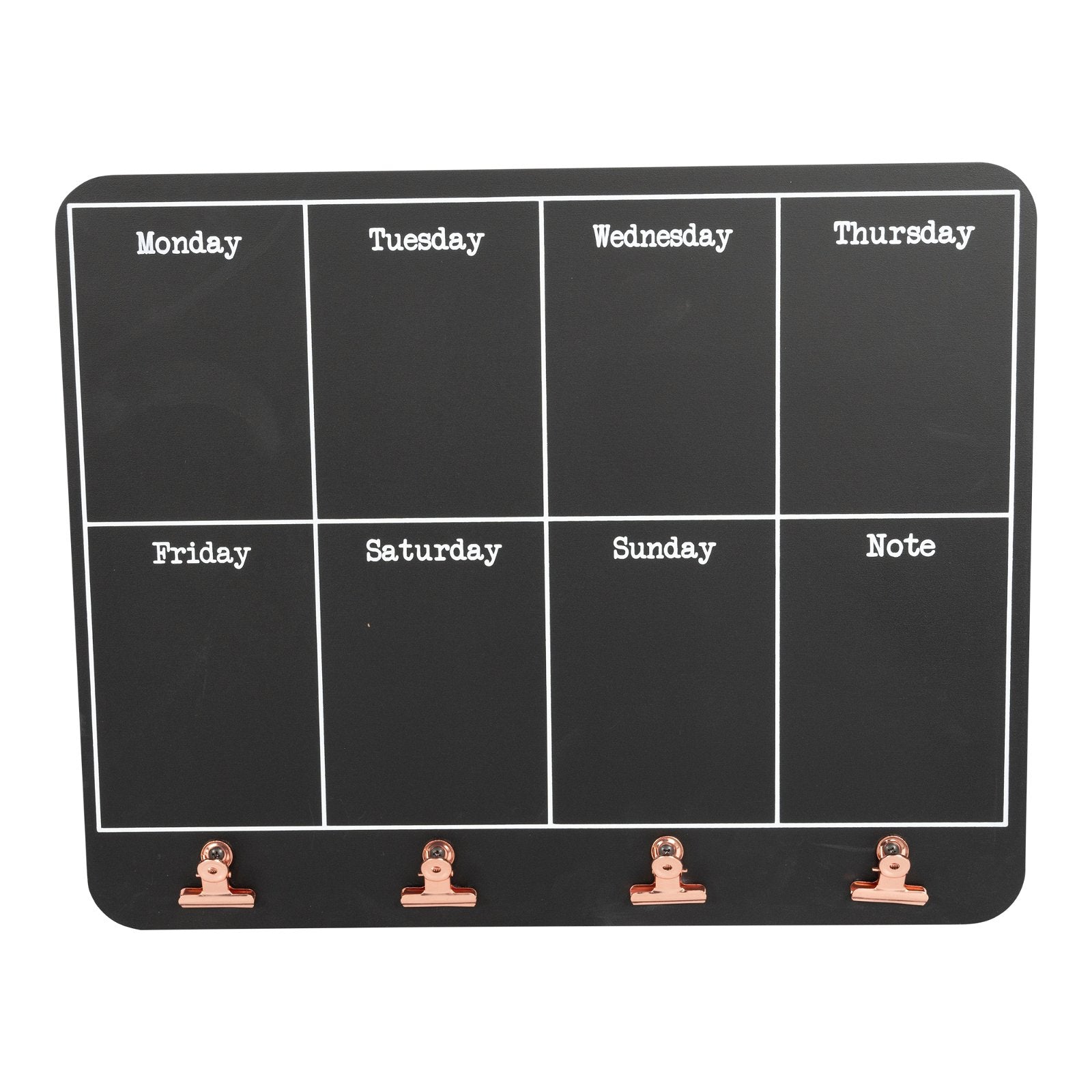 This Black Weekly Memo board with four copper clips would fit perfectly in any home. The item features seven days and a notes area, enabling daily planning for the whole family. The dimensions of each day section is 12x16cm. Overall measurements are: D3.5 x H40 x W50cm SKU: KG0247