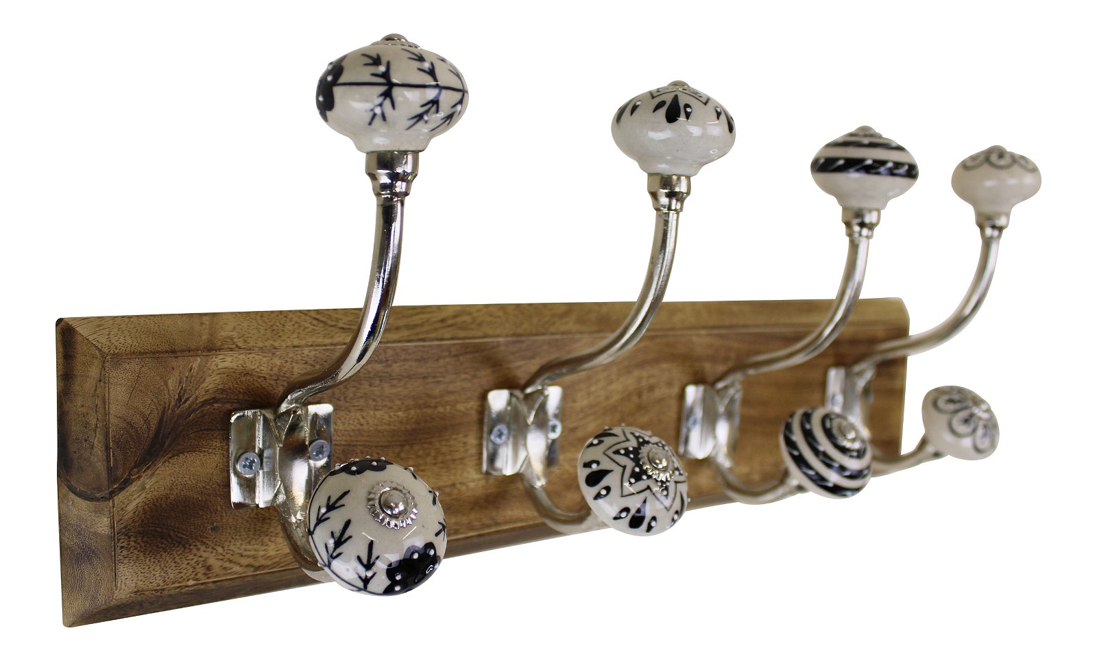 Black and white ceramic hooks on a wooden base, stylish and ornamental, making a functional item beautiful. Wooden base 44x10.5cm each hook 16x8cm Measurements: 44 x 8 x 16cm SKU: HH5612