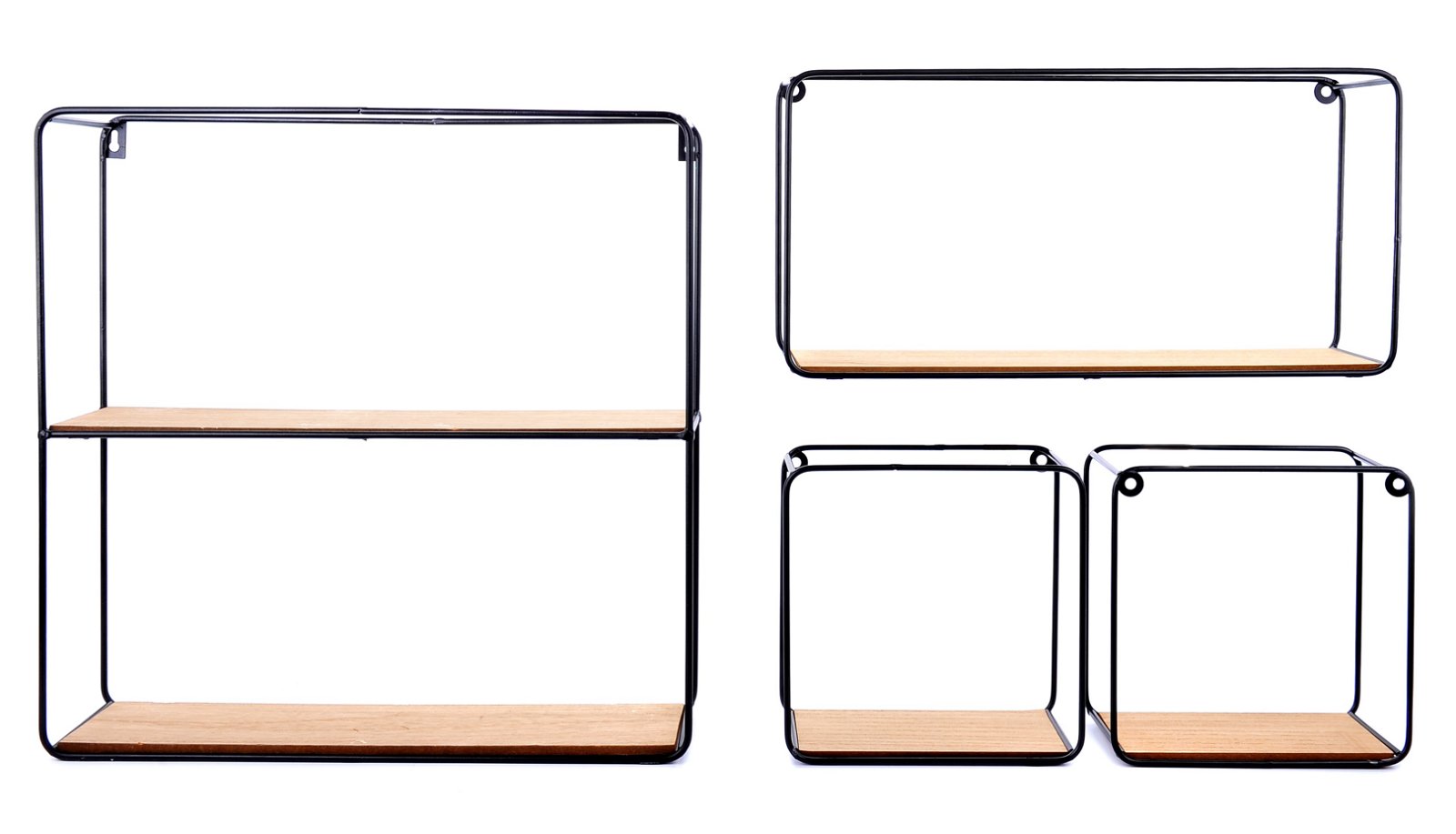 Set of 4 stylish black powder coated metal storage shelves in cube and rectangle shapes. Each shelf includes wall hanging brackets. The three smaller shelves slot inside the large one. Measurements: Large shelf: W37.5cm x D10cm x H72cm. The two small shelves: 17.5cmX10cmX18cm. Medium shelf: 35cmX10cmX17cm. SKU: SG0207
