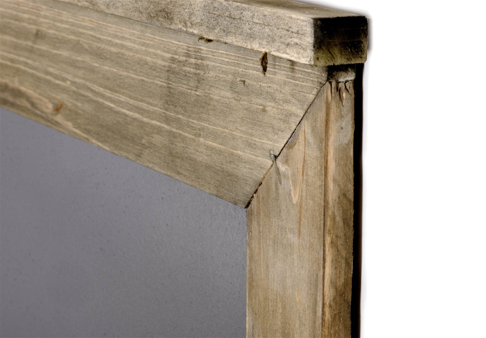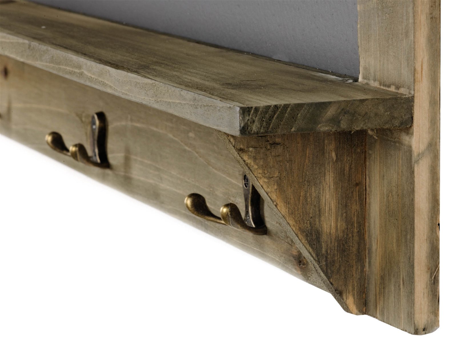 A useful well made antique wooden surrounded blackboard complete with wooden shelf and 3 antique brass effect double hanging hooks. The complete measurement of this item is 70 x 79cm with the shelf measuring 79 x 7cm. The hooks are then situated below the shelf.