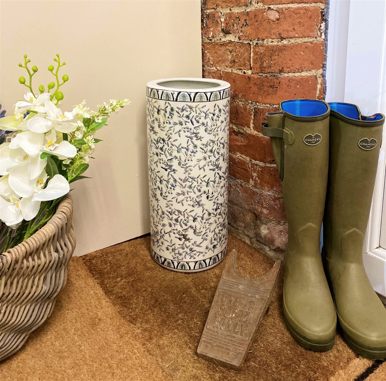 Blue and off White Ditsy print ceramic umbrella stand, with antique effect crackle with a gloss finish. Perfect for keeping your hallway tidy. The internal diameter is 16cm and will hold several umbrellas. Matching jug and bowl available. Measurements: D20 x H46 x W20cm