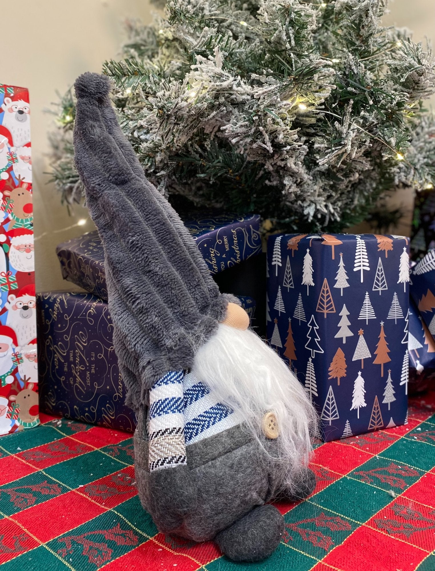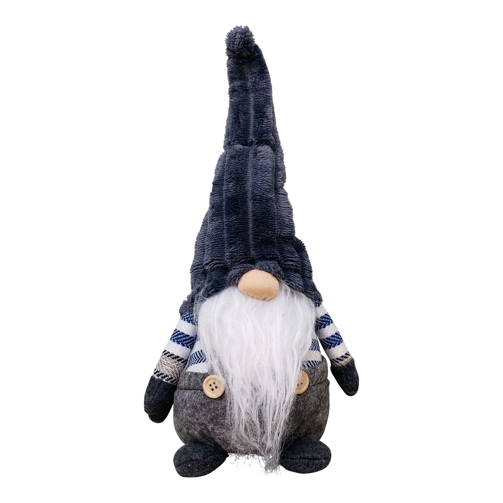 Blue and dark grey fabric sitting Gonk. Festive character to decorate any home at Christmas time. The hat is strengthened by wire for support and styling. Measurements: D11 x H36 x W16cm
