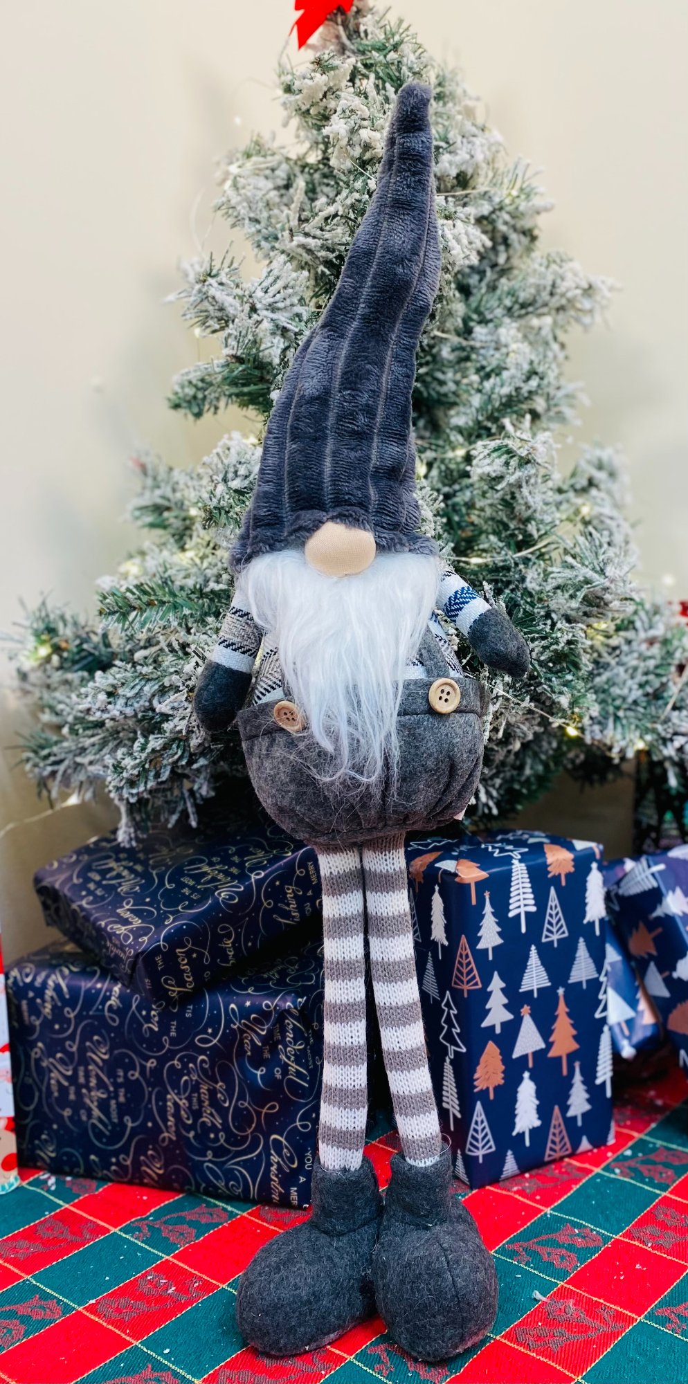 Dark grey and blue fabric standing Gonk. Festive character to decorate any home at Christmas time. The hat is strengthened by wire for support and styling. The leg length measures 20cm and is fixed. Measurements: D11 x H60 x W16cm