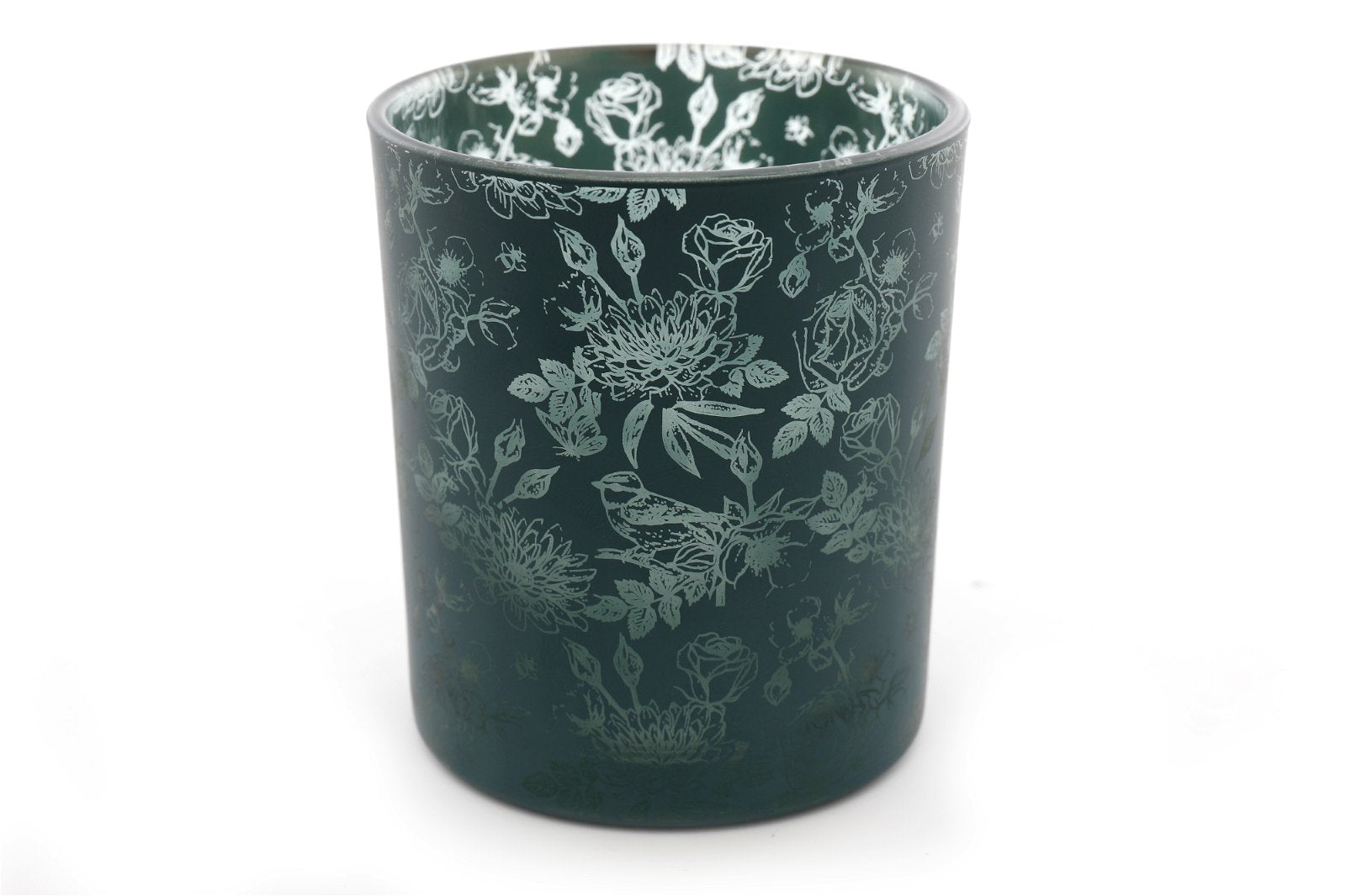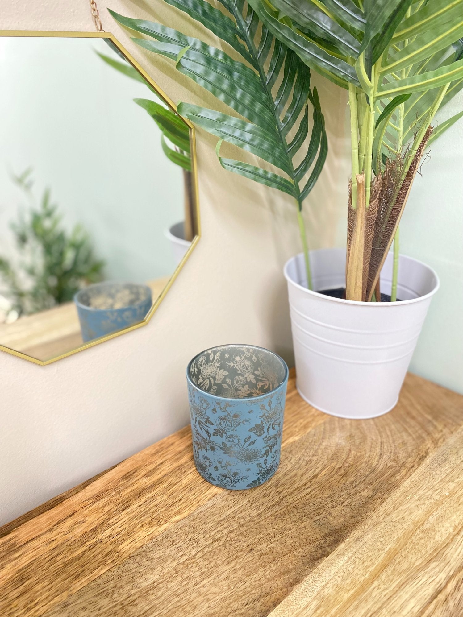 A glass tealight holder with an attractive botanical design in blue. The stencilled effect would be enhanced by the flame of the tealight. Measurements: D9 x H10 x W9cm SKU: BL0501