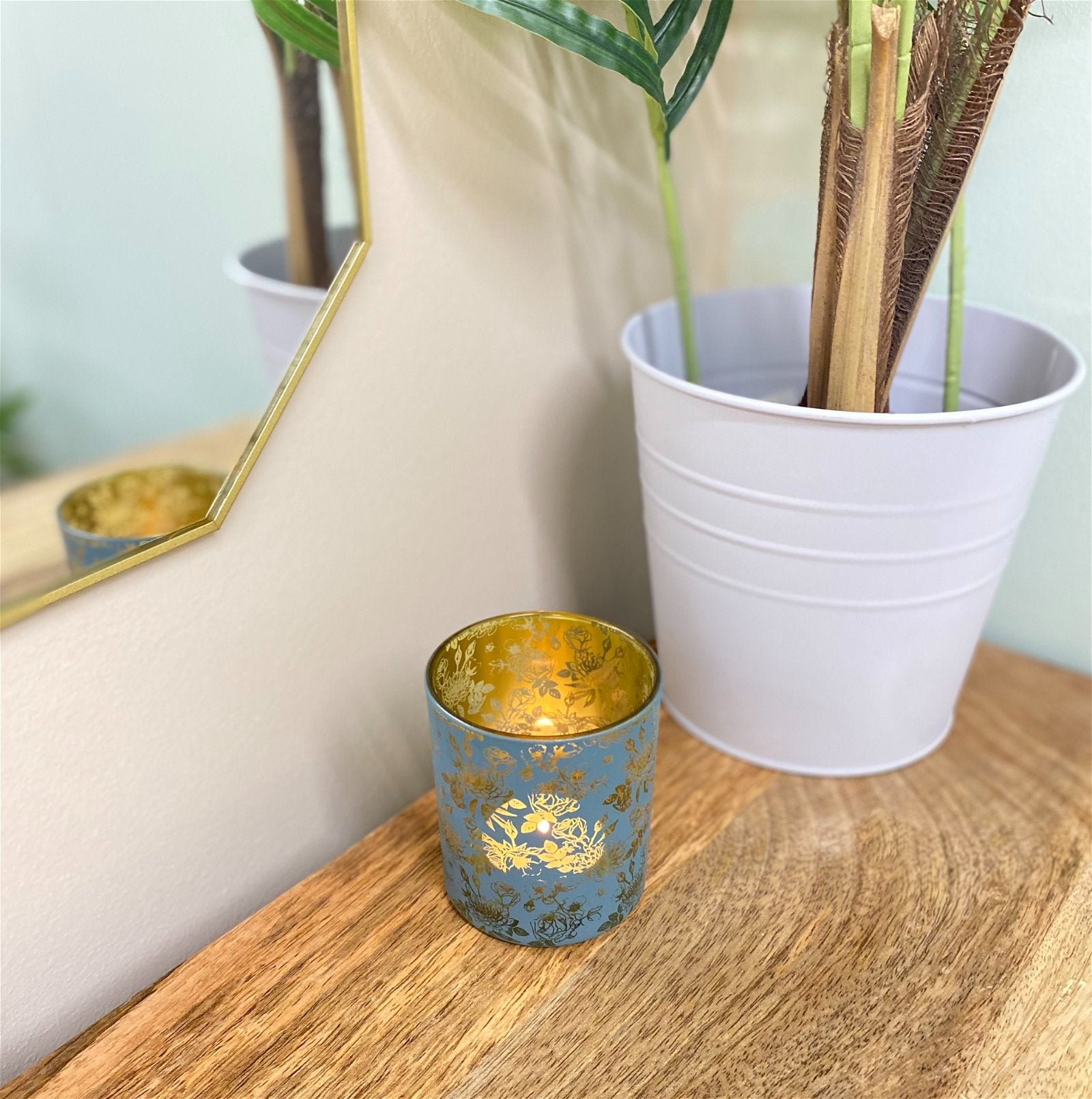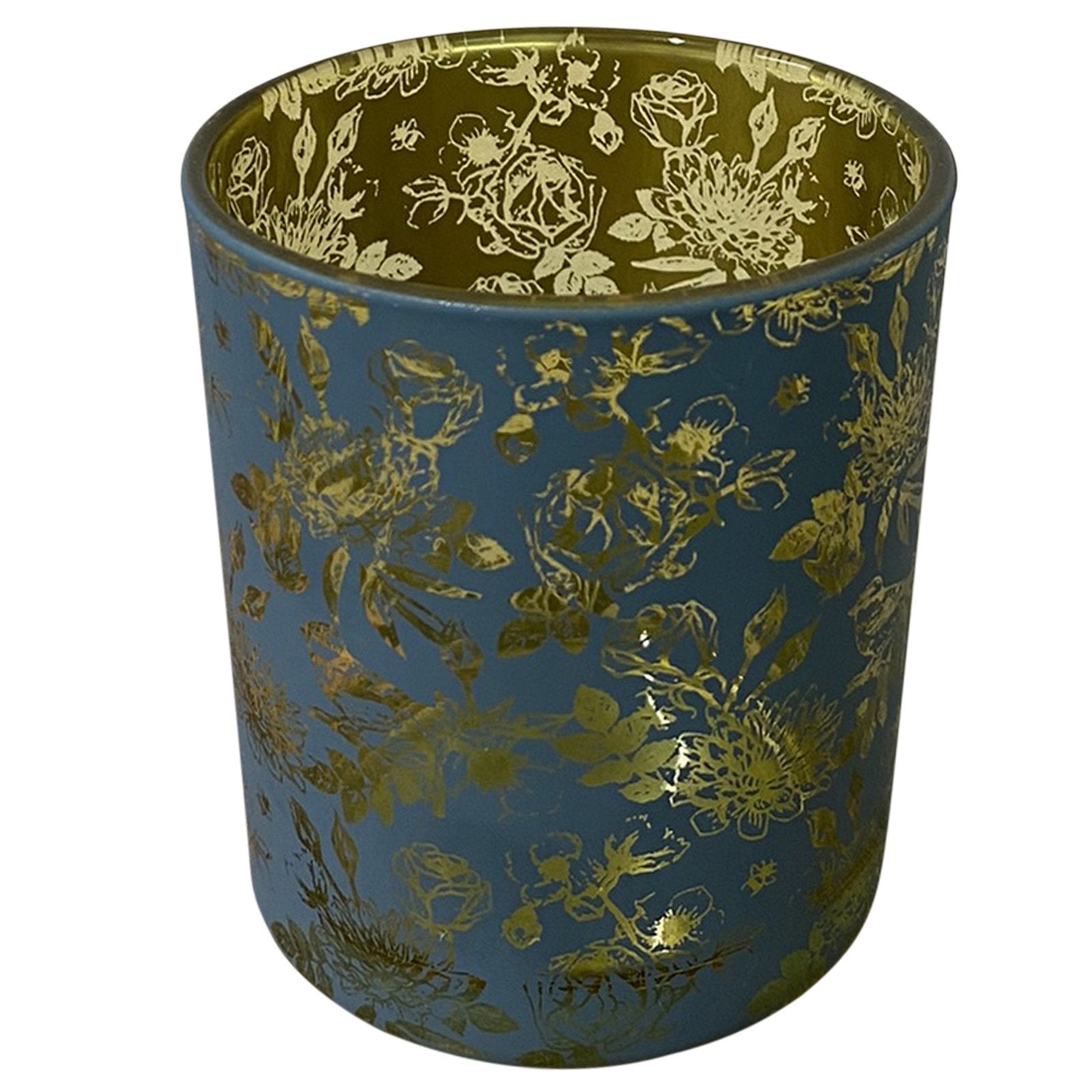 A small glass tealight holder with an attractive blue and gold design. The inside of the glass has a hint of gold which complements the delicate botanical print in blue. Measurements: D7 x H8 x W7cm SKU: BL0500
