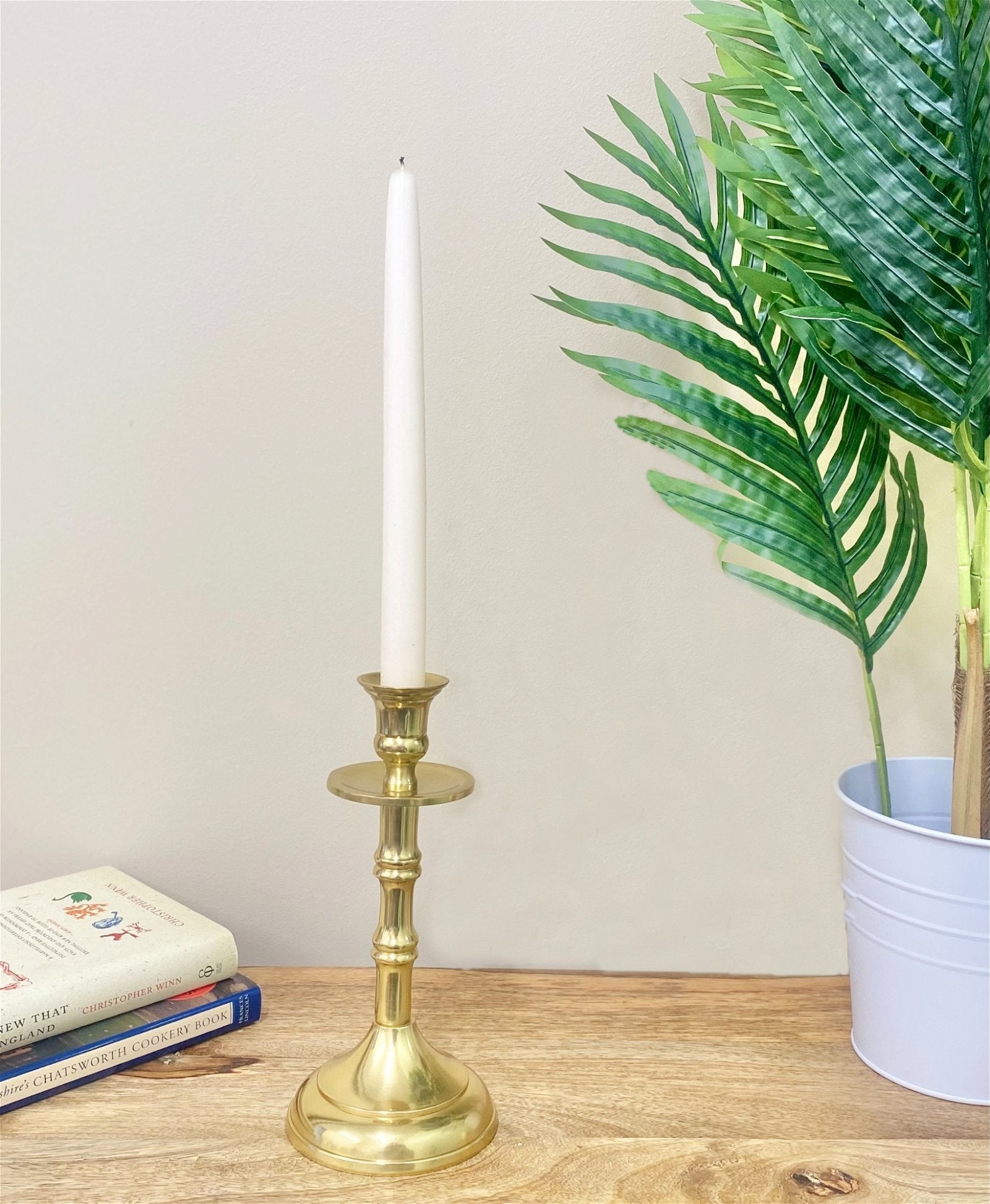 Brass colour traditional style candle holder for a tapered dinner candle of 2cm diameter. The candlestick’s height is 22cm and base is 10cm diameter. Overall measurements are: D10 x H22 x W10cm SKU: BP0139