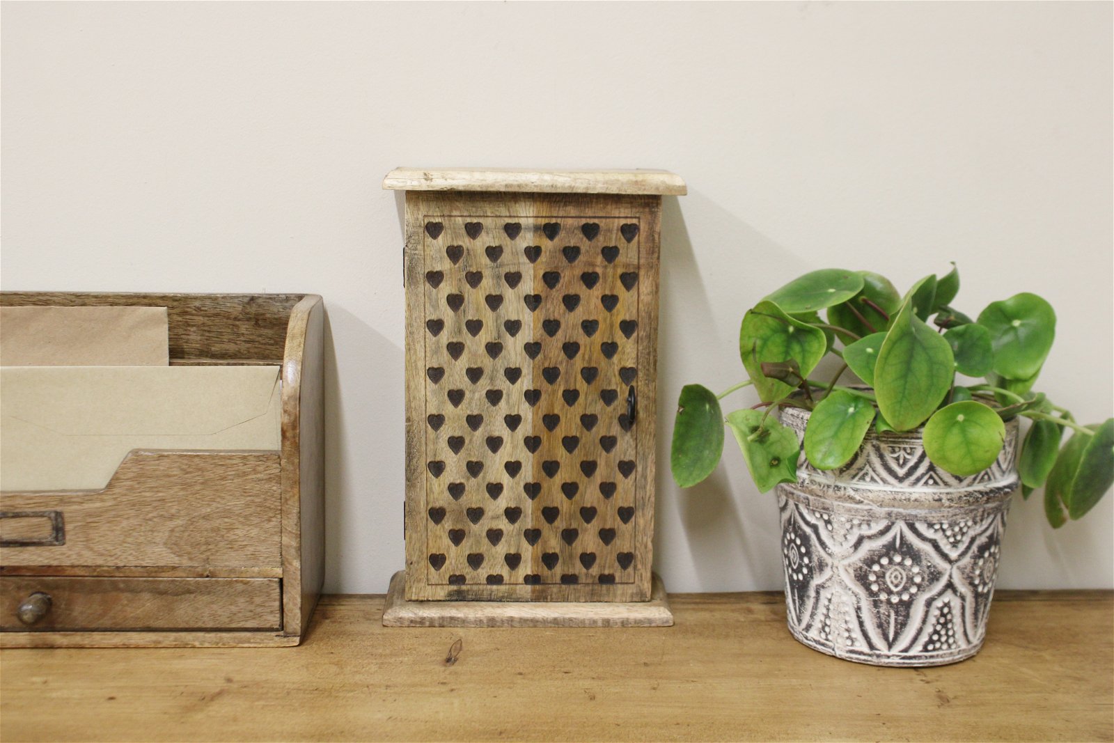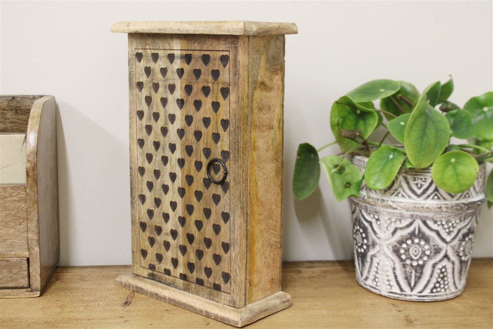 Wooden key box made from polished mango wood, delicately decorated with small heart shapes. This key box has space for six sets of keys. The box can be wall mounted or free-standing. Great gift idea for a house warming present. Measurements: D8 x H28 x W15cm