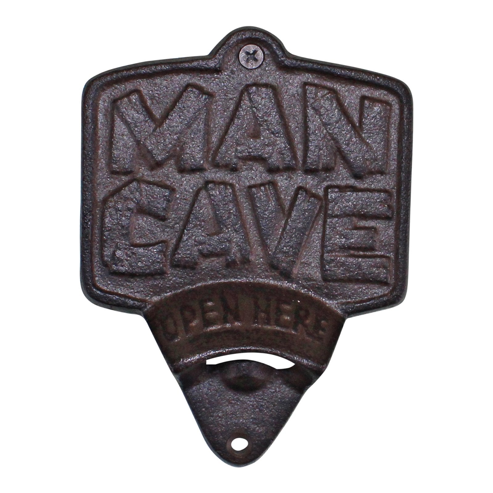 This wall mounted bottle opener features the wording "Man Cave" and "Open Here" with a single bottle opener underneath. Made of Cast Iron and featuring 2 holes for easy wall mounting. Measurements: 3 x 14.5 x 10.5cm