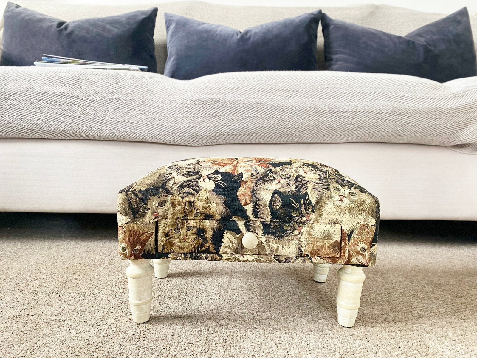 Cat fabric footstool with a single drawer. A sturdy footstool covered in a cat print design. This footstool has a useful storage drawer with a wooden handle, it is both practical and stylish in all homes. Wooden legs are included inside the footstool, the legs screw into the base, no tools are required. Measurements (W x D x H): 41cm x 26cm x 28cm. Legs are 11cm in length. Inside drawer measurements (W x D x H): 27cm x 22.5cm x 5cm. Measurements: D26 x H28 x W41cm