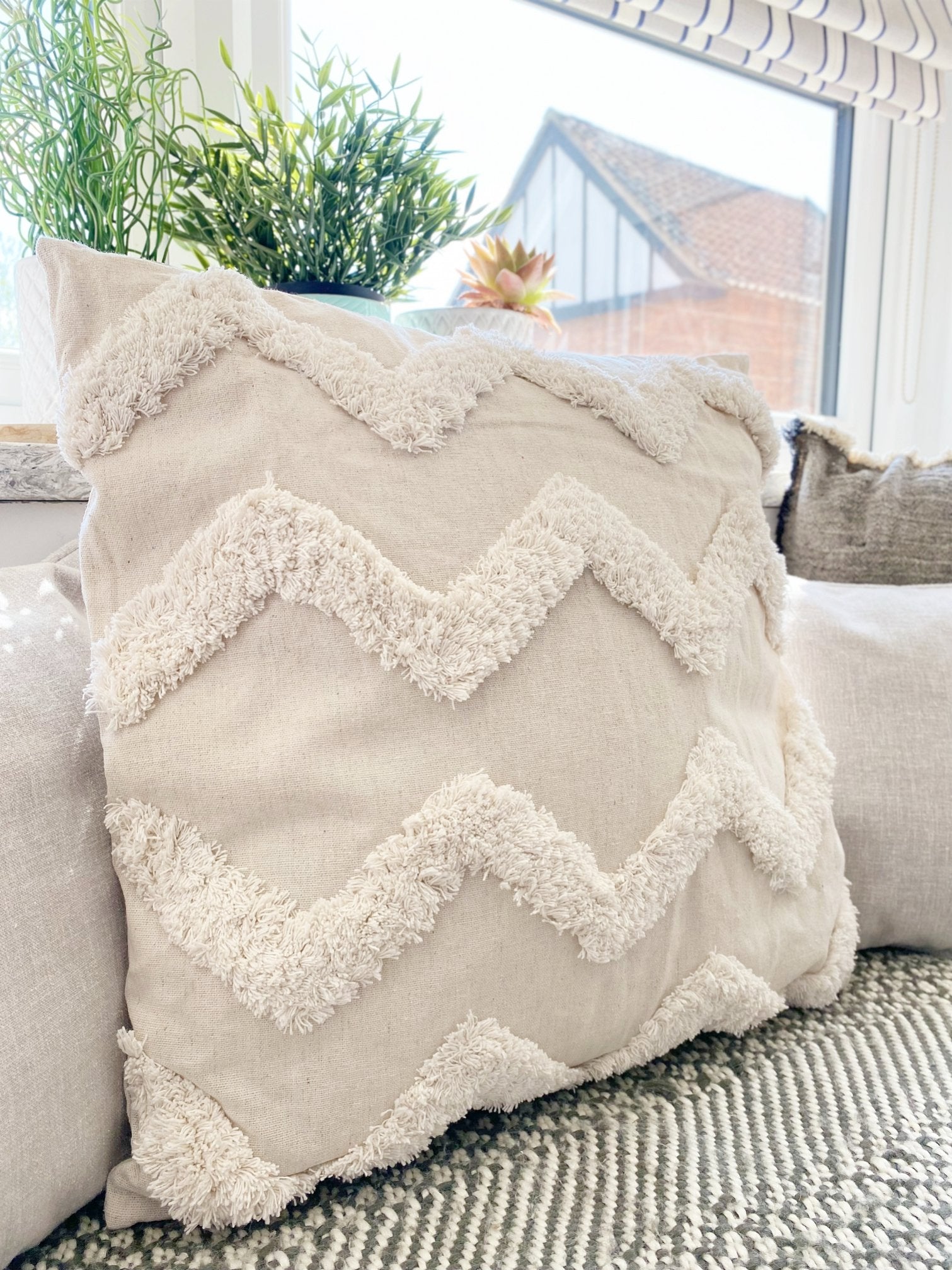 Add some style and texture to your home with this tufted chevron design scatter cushion. With an intricate stitch detail, this cushion comes in earthy taupe tones which will compliment all modern and contemporary interiors. Made from 100% cotton, polyester cushion pad included. Sponge clean only. Measurements: D2 x H41 x W41cm
