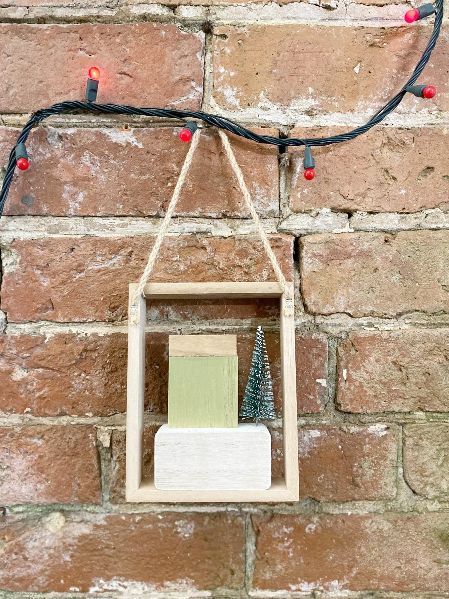 A wooden picture frame with with a small house, Christmas tree and Christmas message. A lovely festive wooden picture frame with a message in green saying "Its beginning to look a lot like Christmas". A festive addition to any tree or wall. Overall measurements including hanging rope: D3 x H29 x W12cm