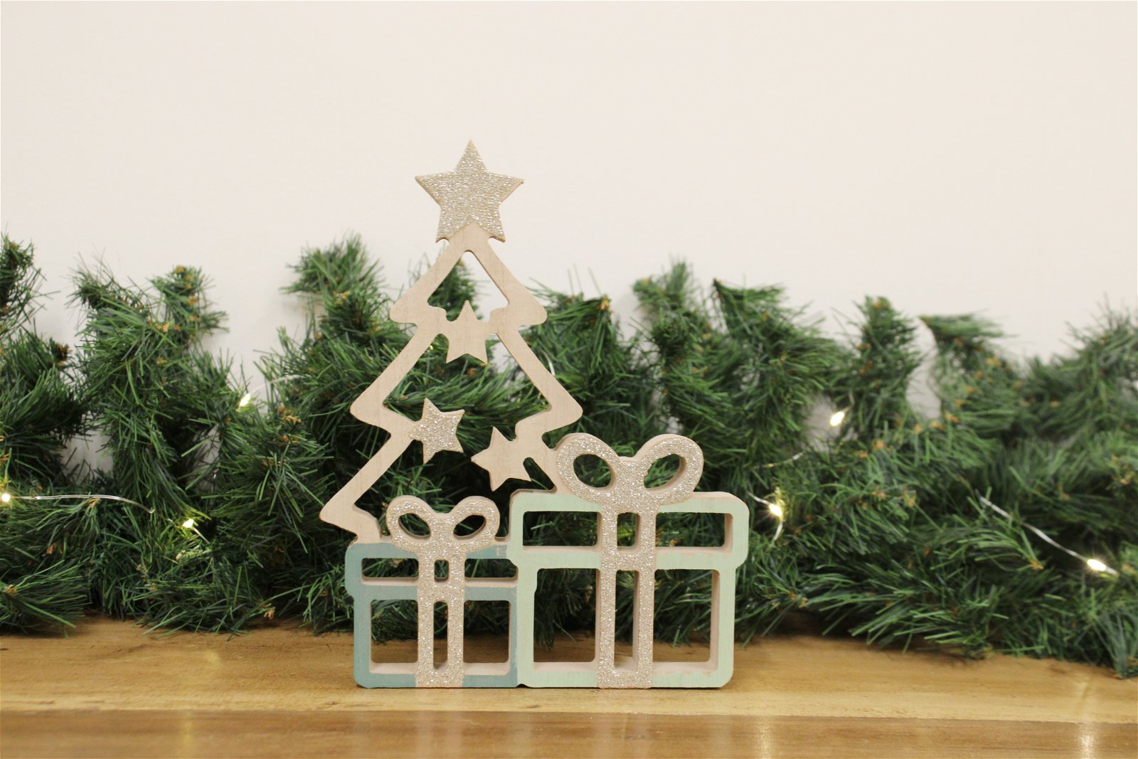 Free-standing wooden Christmas tree with two green presents decoration. With glitter detailing. Measurements: D2 x H21 x W17cm