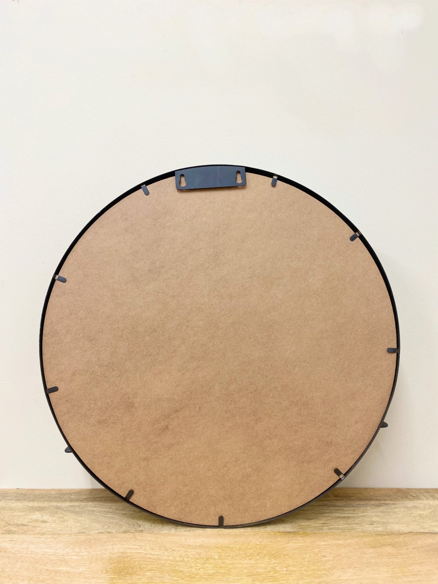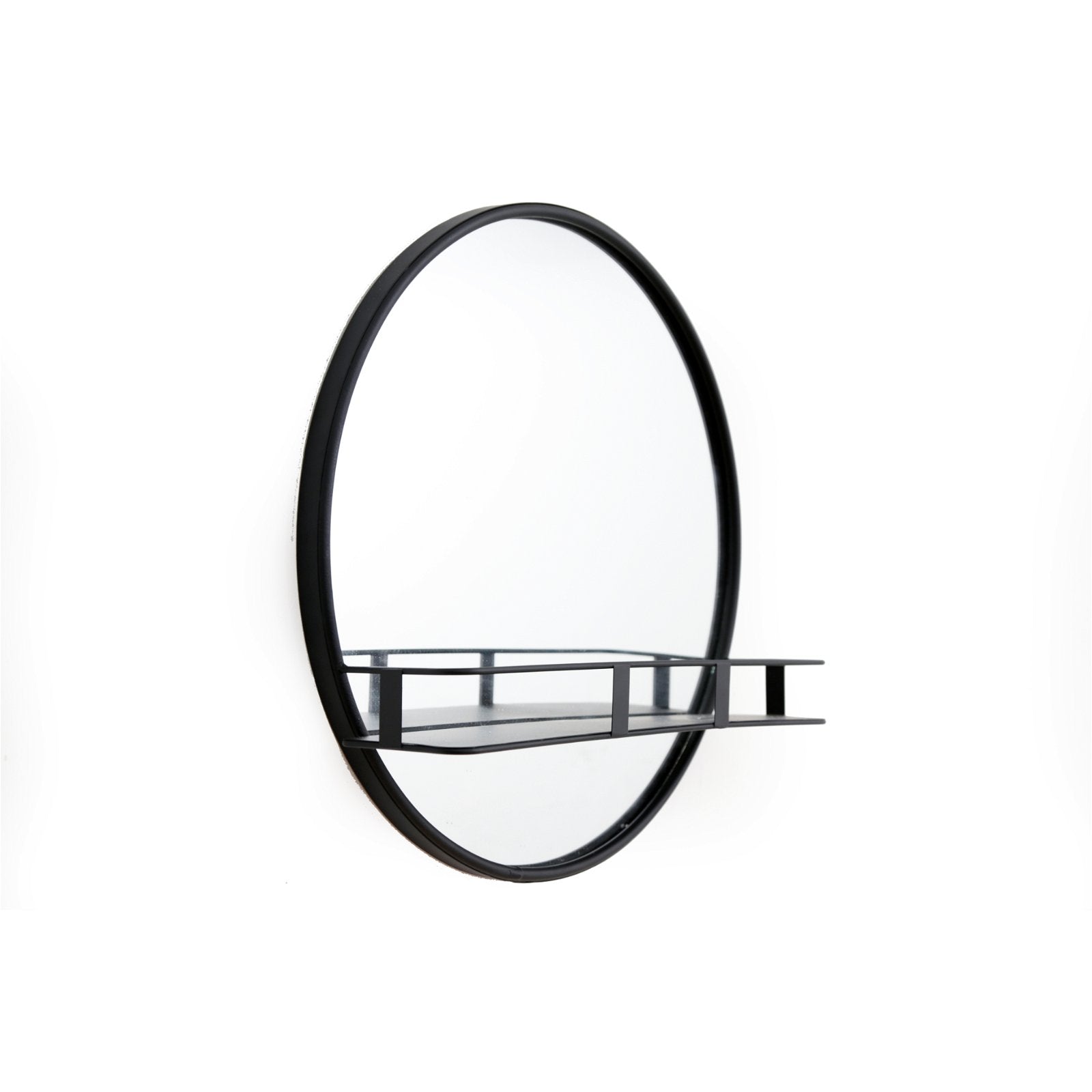 An elegant metal circular mirror in black with a handy shelf. A classic item to enhance any space within the home. The useful tray shelf is 46cm x 9.5cm with a side measurement of 5cm. The overall measurements are: D50 x H12 x W50cm
