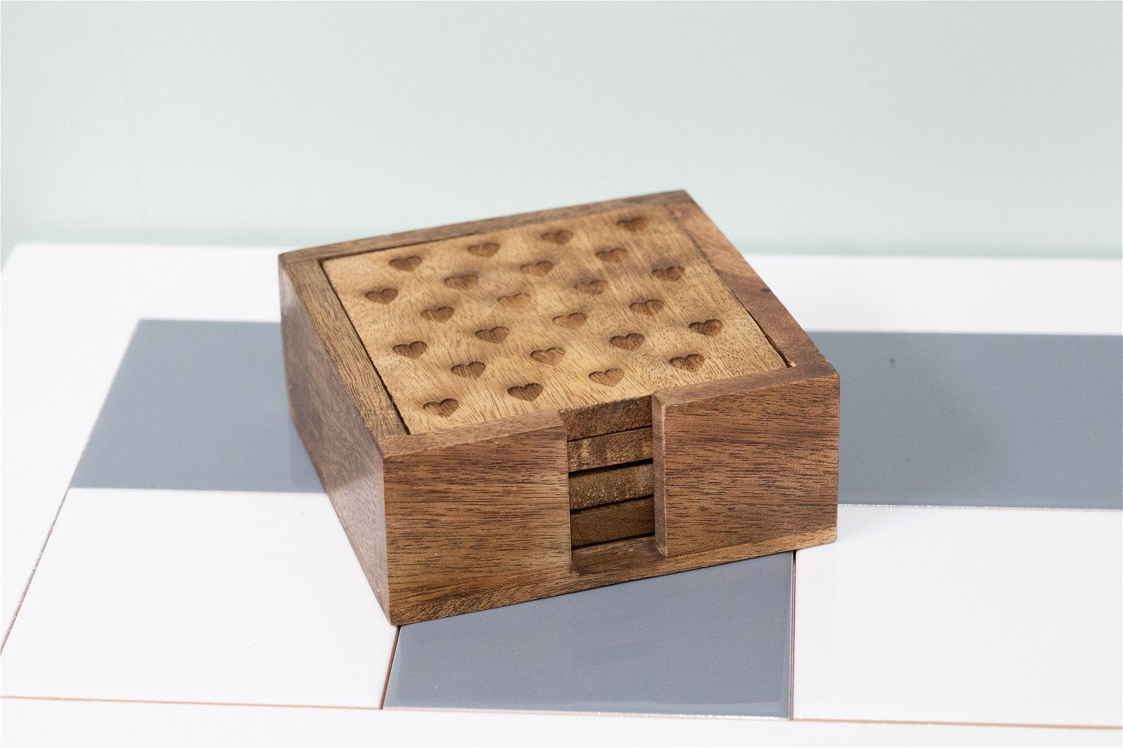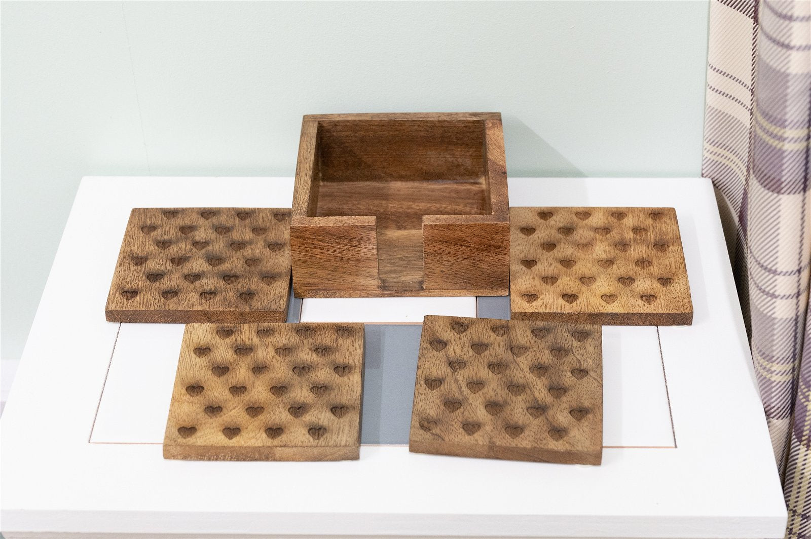A set of four square wooden coasters with hearts imprinted, stored in a wooden cradle. The wooden coasters have small heart shapes imprinted. The coaster dimensions are 10x10x1cm stacked within a wooden cradle that’s 1cm wide. Overall measurements are: D5 x H12 x W12cm SKU: KG2004