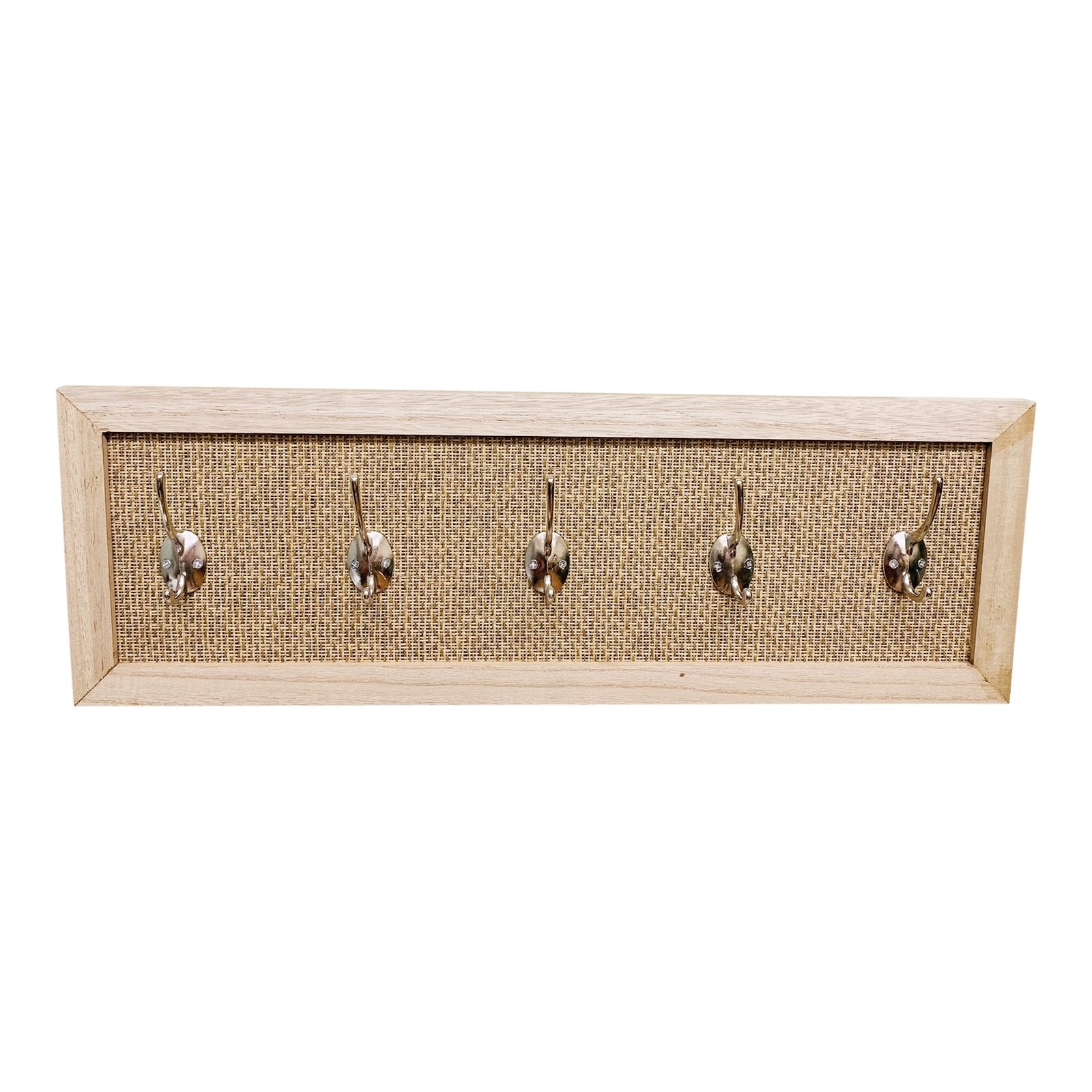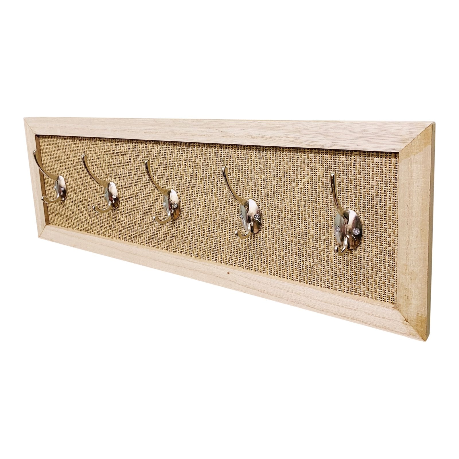 This item has 5 silver hooks attached to a wooden and rattan effect board with 2 wall fittings. A functional piece with a natural feel. The wooden frame is 2.5cm with rattan effect background having 5 double hooks 5cm apart and 2 wall fixings. Measurements: D5 x H20 x W60cm SKU: SR0086