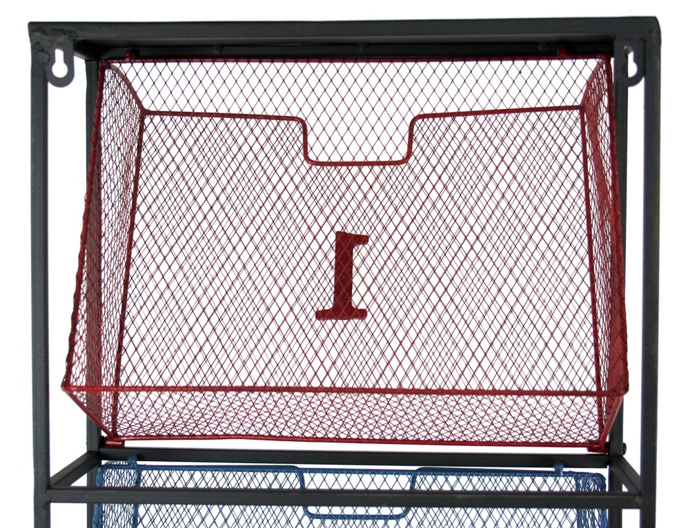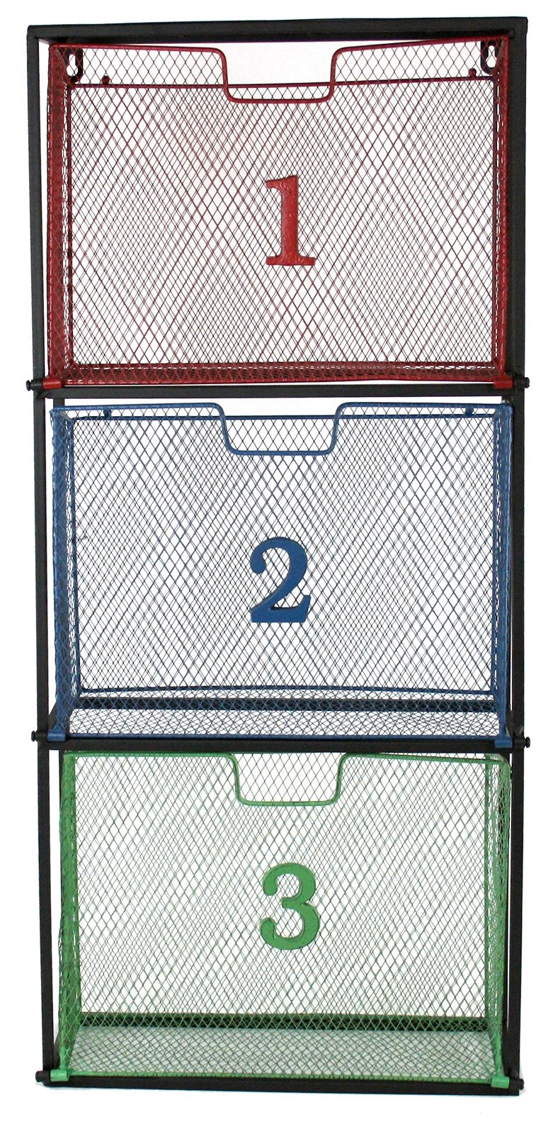 This is a really funky wall filing unit or magazine rack made from metal with 3 coloured and numbered drop forward metal mesh drawers. The unit has 2 keyhole fixings to the back for easy wall hanging (fixings not included). Great for storing papers and homework in the study or for use as an urban style magazine rack! Measurements: 74.9 x 34.3 x 12.1cm