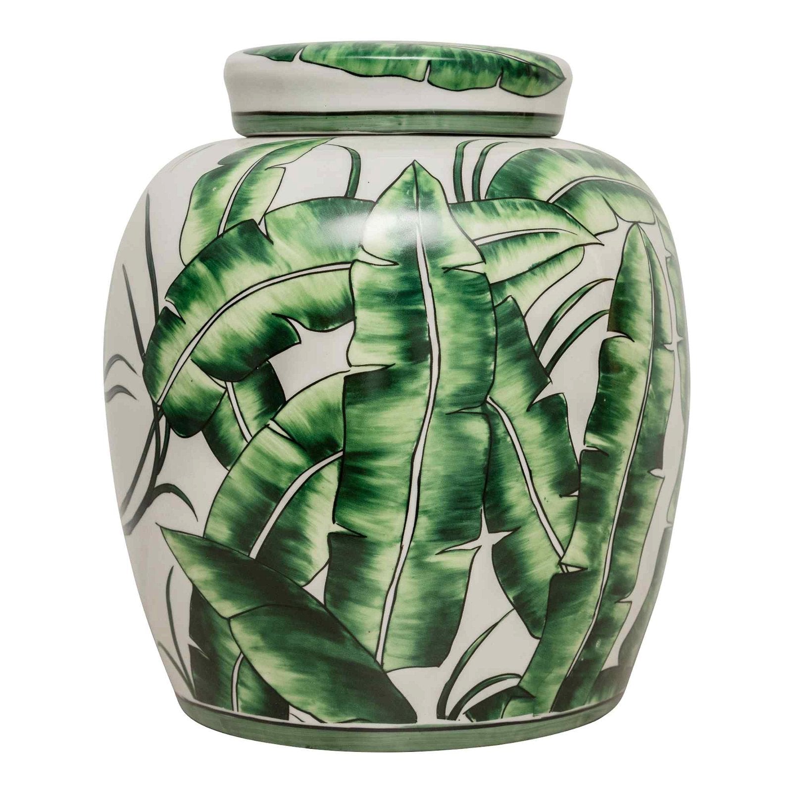 Adding a little burst of colour with these Corn Plant inspired leaf design, this ginger jar would look lovely in a modern and fresh room. This jar has an overall height of 30.5cm and diameter of 25cm. The opening where the lid sits has a diameter of 10cm and the lid size is 16cm. Overall measurements: D30.5 x H25 x W25cm