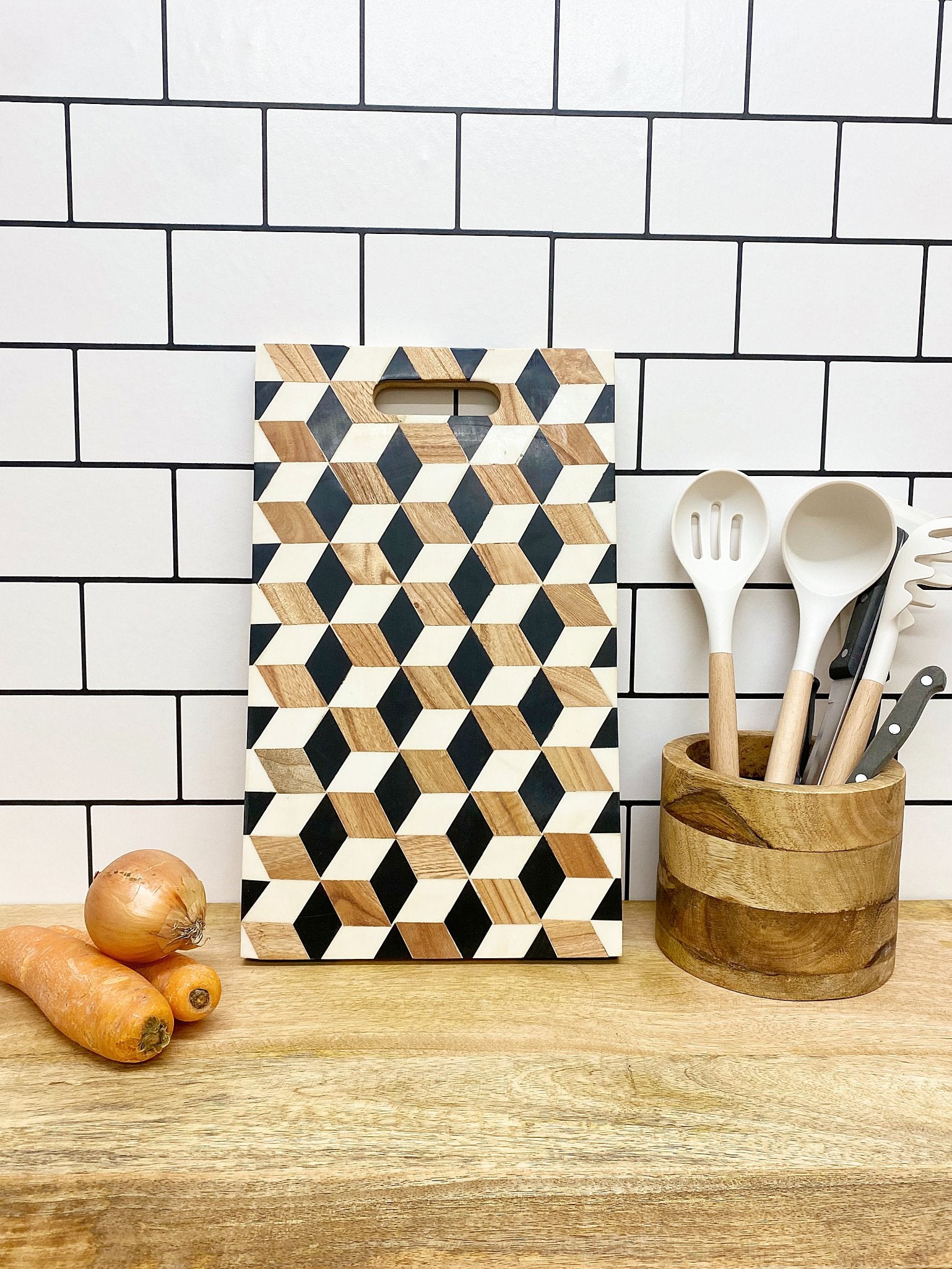 An intricate MDF serving tray with a polyresin cube design overlay with cut out handle. This serving tray is food safe, can be used to cut up or serve food on or is unique enough to have on display. Measurements: D2 x H40 x W24.3cm