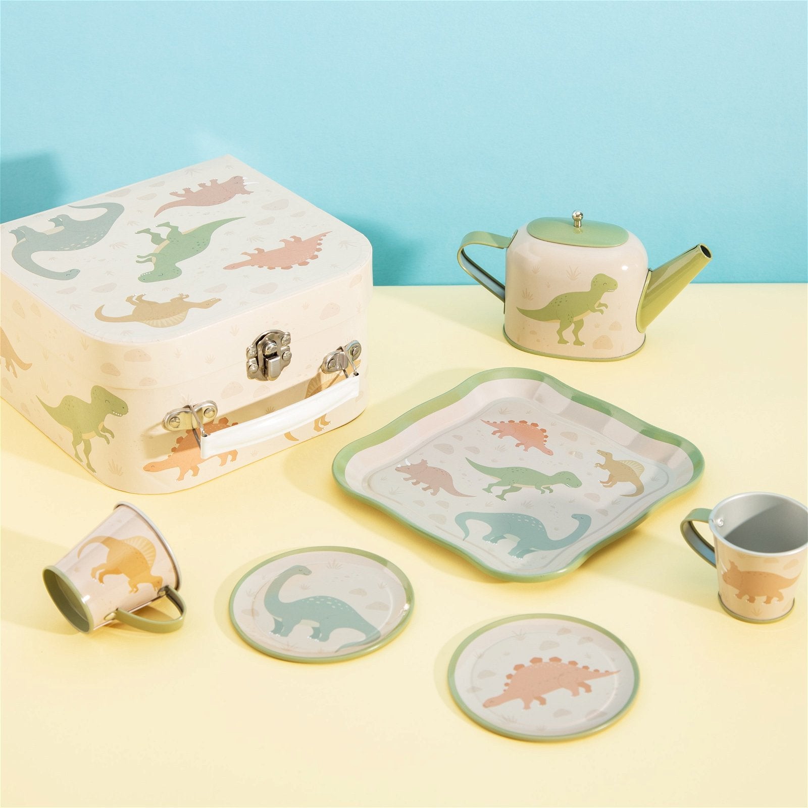 This set includes one tray, one teapot, two plates and two teacups. Crafted from tin and finished with a dinosaur design, featuring a colourway of earthy greens. This item is an imitation toy set and not suitable for hot or cold drinks. This item is not suitable for children under 36 months old due to small parts which may cause a choking hazard. Measurements: D17.5 x H9.5 x W17cm