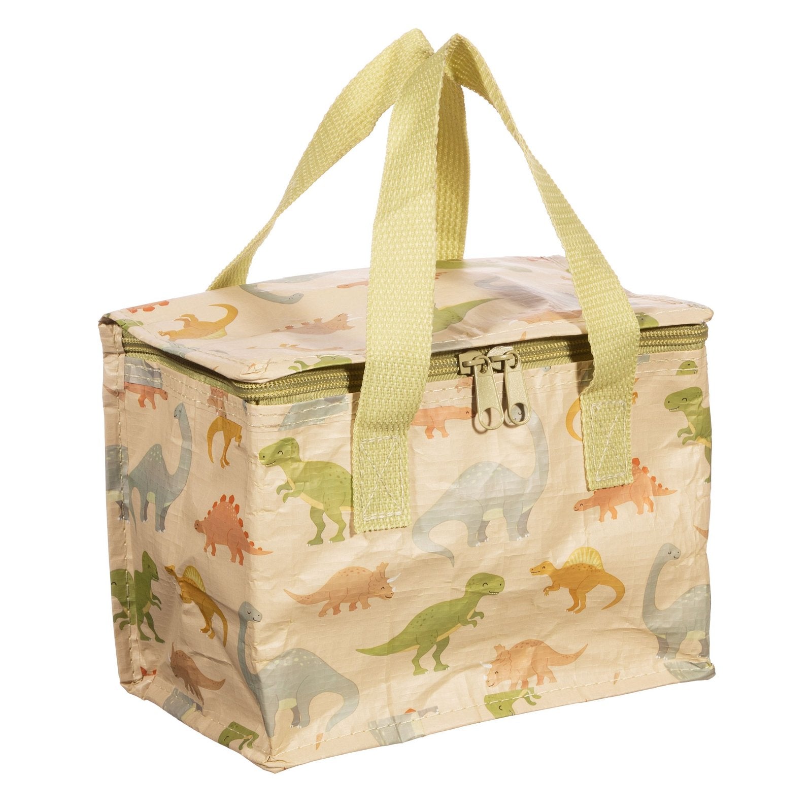 Made from recycled plastic bottles and complete with a fantastic dinosaur design. Featuring a colourway of earthy tones. This insulated accessory keeps snacks cool and refreshed. Measurements: D21 x H15 x W16cm