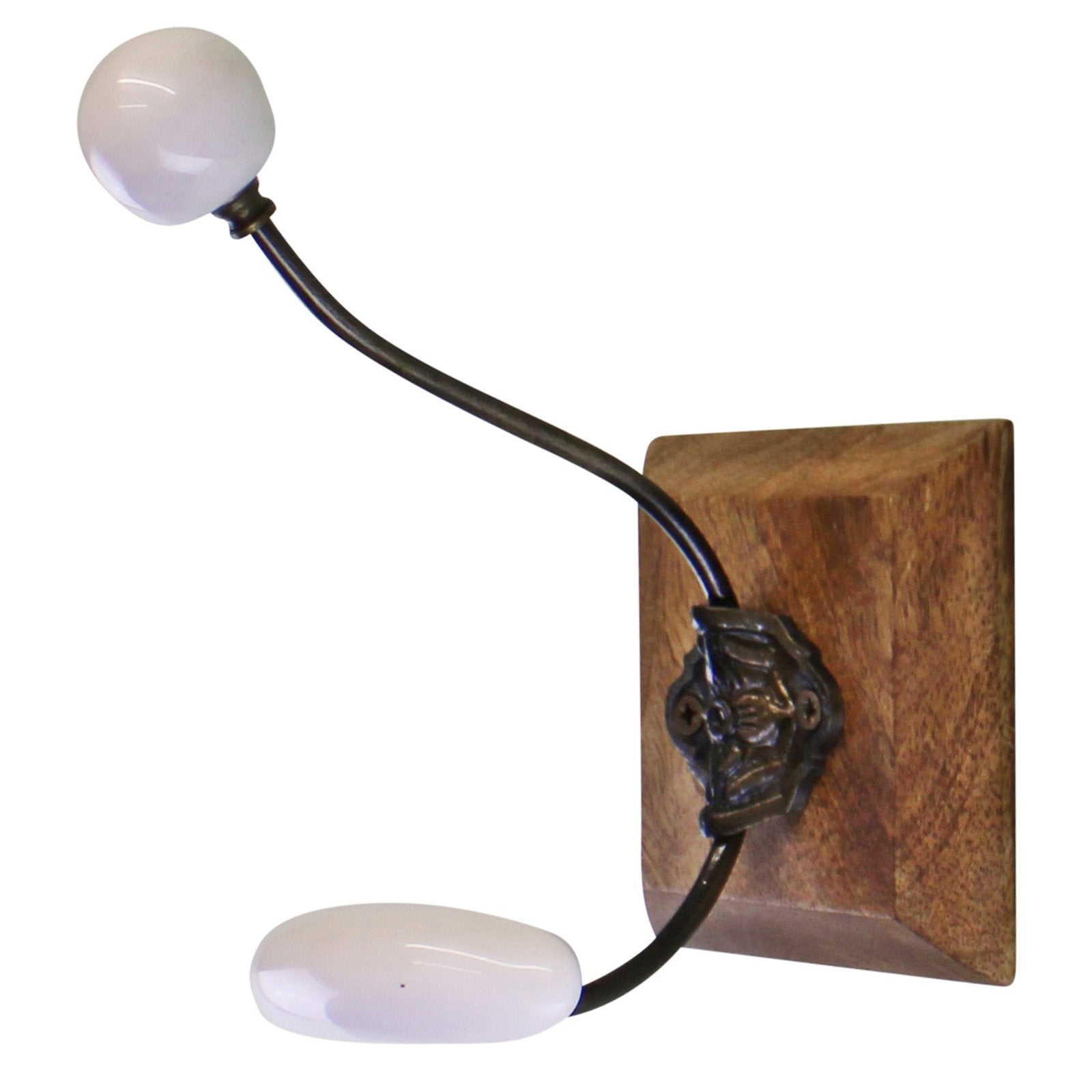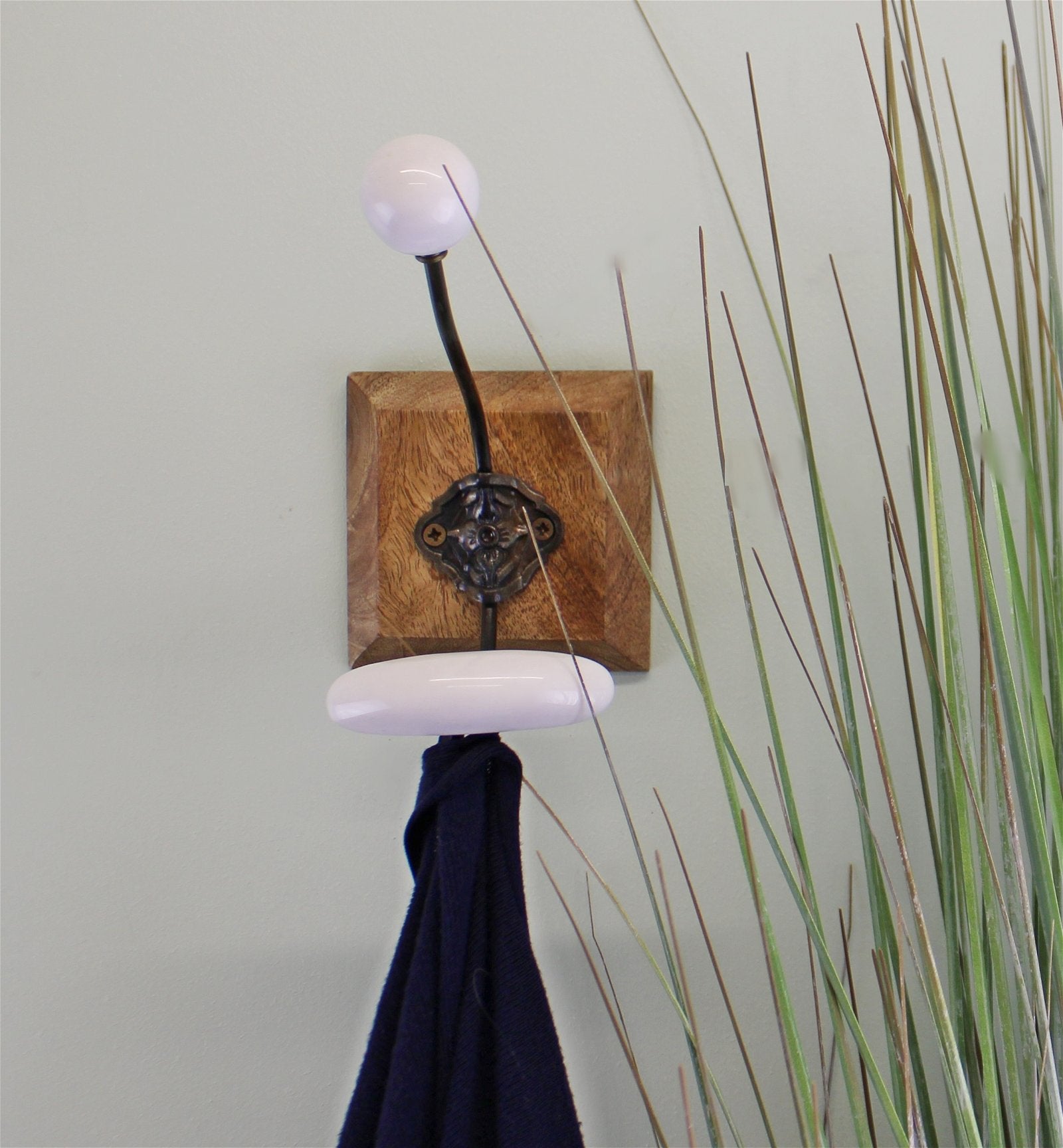 A stylish and simple double coat hook on a wooden base. The knobs are white and ceramic. Ideal addition to a hallway, conservatory or porch. The base is made of mango wood, the hook is iron with ceramic knobs. Fixture to the rear for wall hanging. Measurements: 15.5 x 16 x 10cm SKU: HH5692