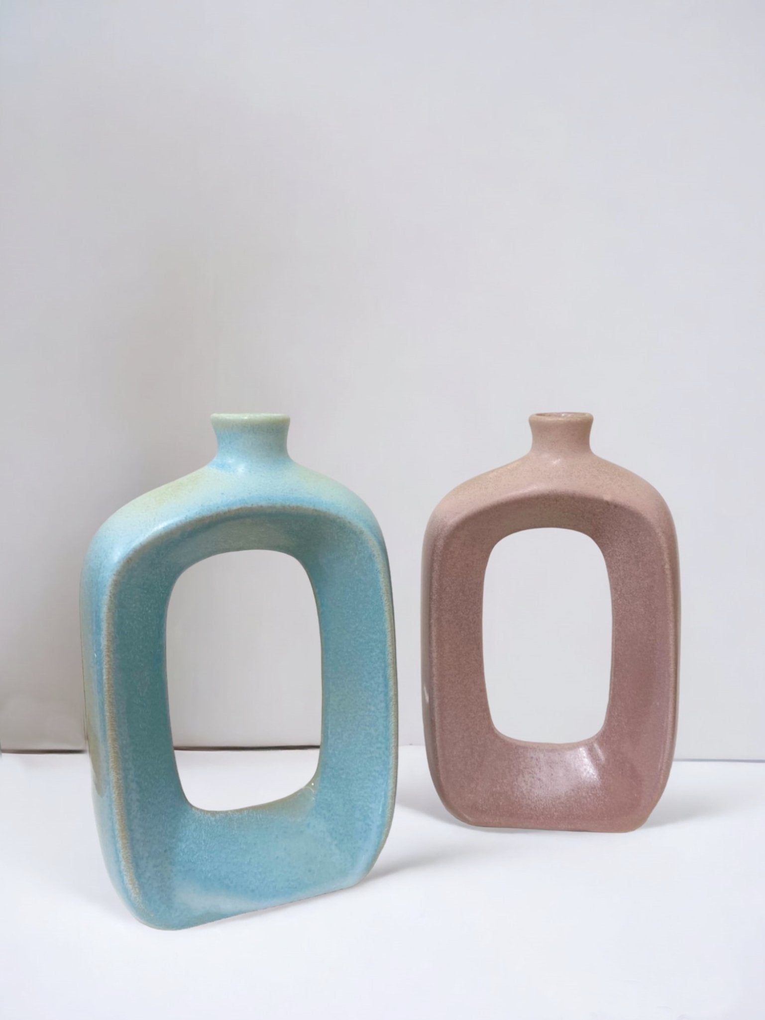 Set of two doughnut bud vases, unique and playful decorative accessories that can be used to display flowers and other natural elements. As the name suggests, the vases have a shape that resembles a doughnut or a ring. The doughnut bud vase is a fun and quirky addition to any decor style, from modern to bohemian. Comes in a set of two matt blue and pink. Each vase is 5.5 cm deep and made of high-quality ceramic. Measurements: D11.5 x H24 x W14cm
