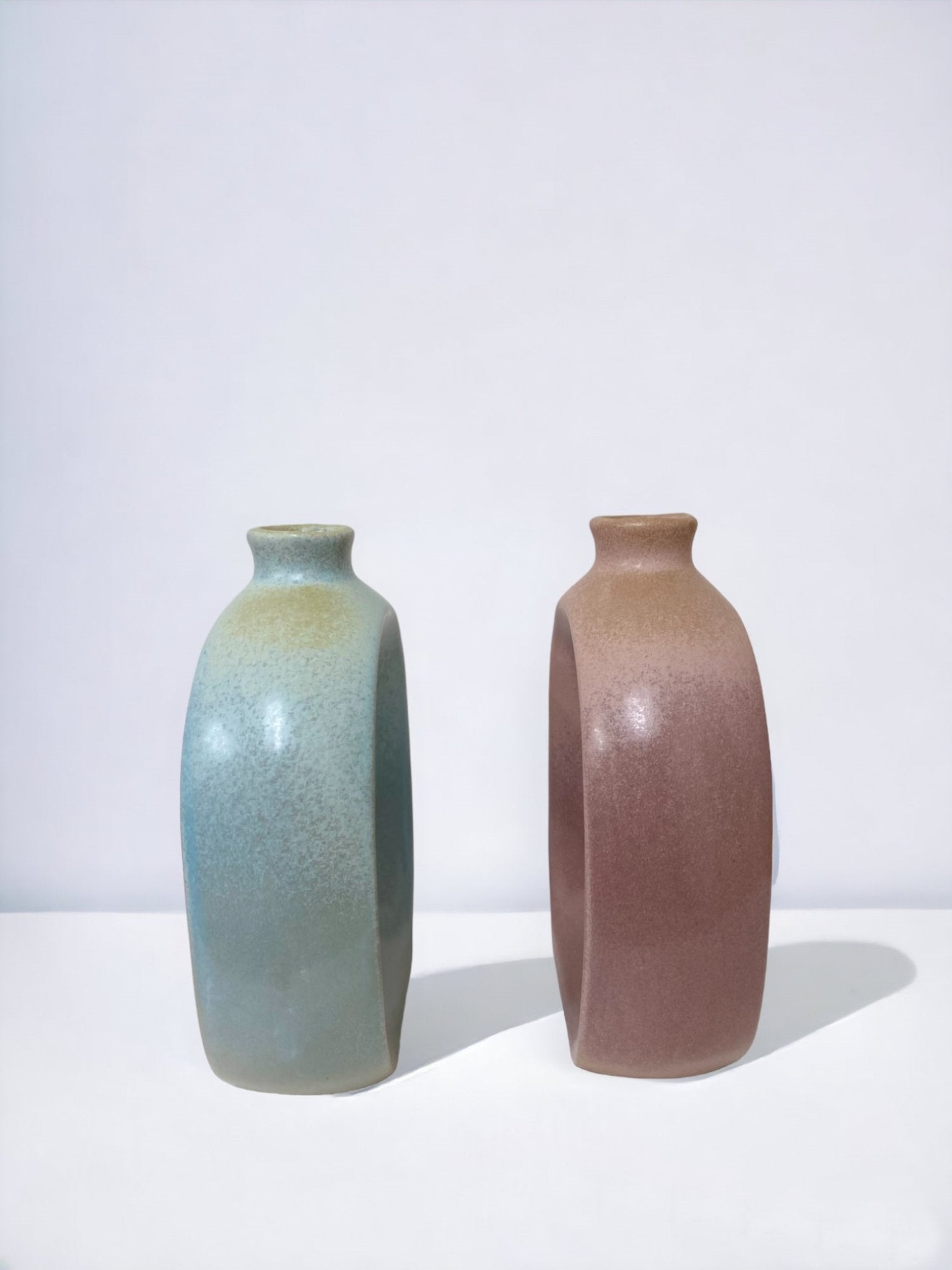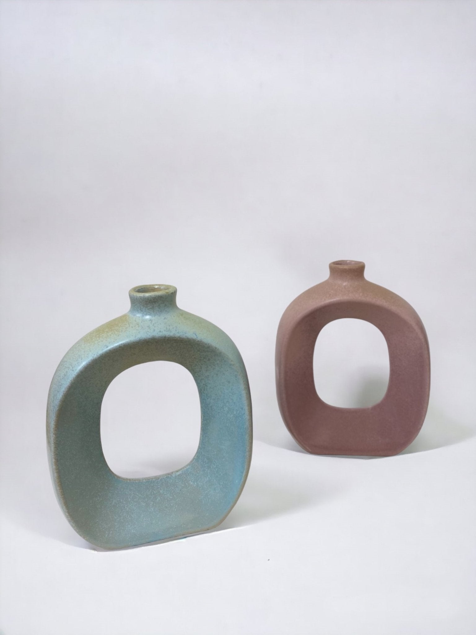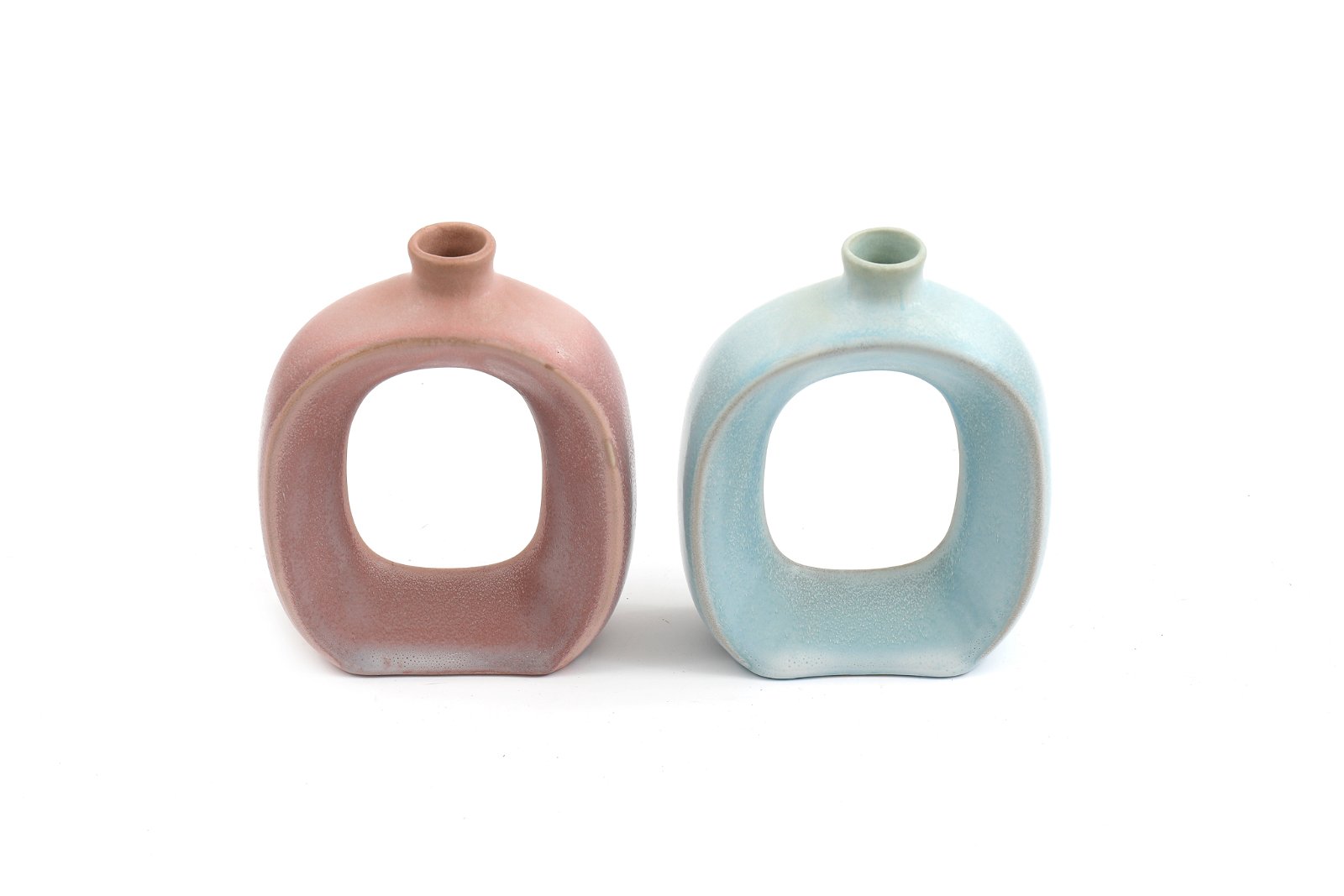 Set of two doughnut bud vase, unique and playful decorative accessories that can be used to display flowers and other natural elements. As the name suggests, the vases have a shape that resembles a doughnut or a ring. The doughnut bud vase is a fun and quirky addition to any decor style, from modern to bohemian. Comes in a set of two matt blue and pink. Each vase is 5.5 cm deep and made of high-quality ceramic. Measurements: D10.5 x H16.5 x W14cm