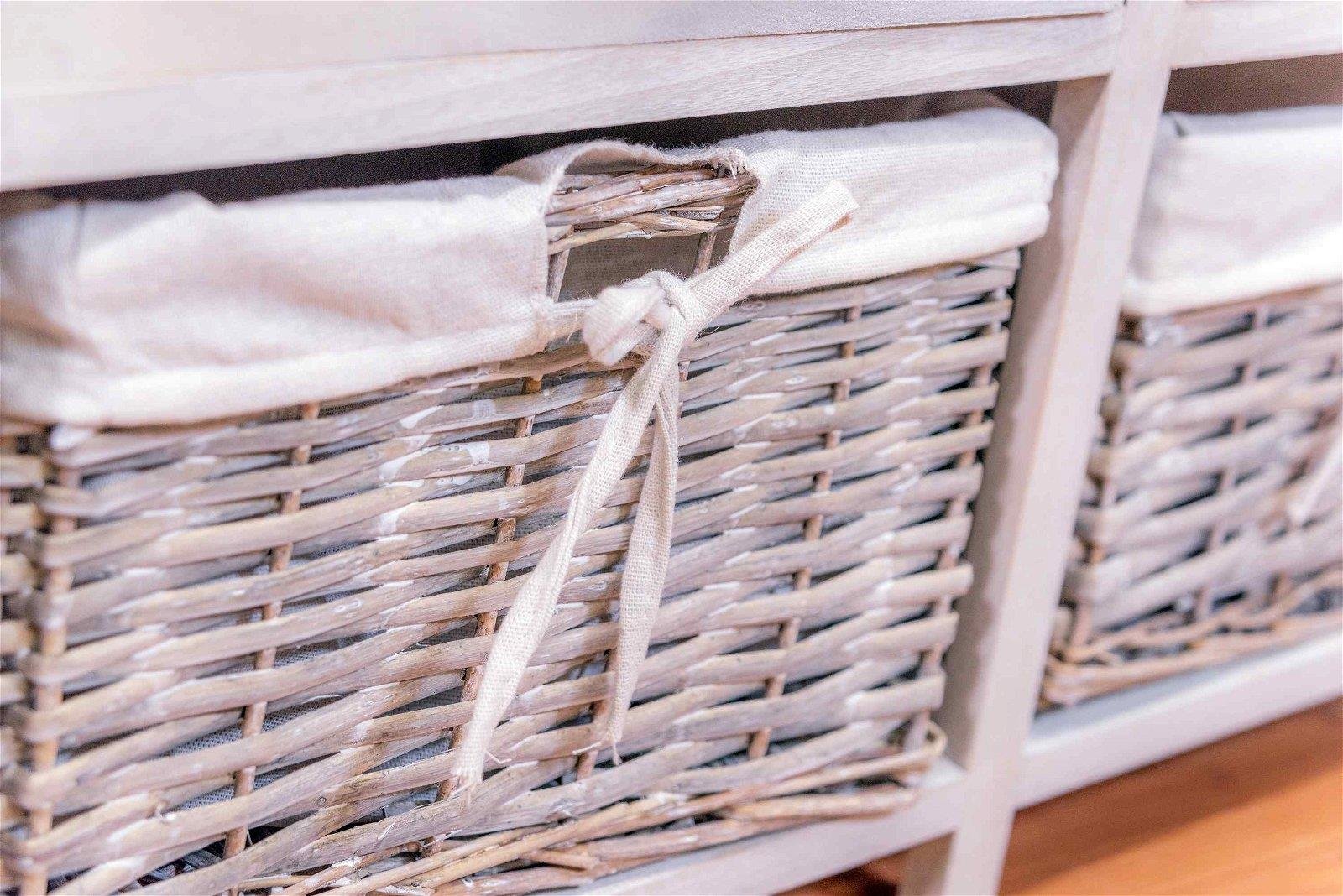 This grey wood grain effect cabinet with 3 drawers and 3 wicker storage baskets would be perfect for storing hats, scarves and gloves in the winter in the hallway. The cabinets overall external dimensions are W107cm x D29.3cm x H43cm. The drawers external dimensions are D24cm x W30.5cm x H10.8cm and the internal dimensions are D22.5cm x W29.2cm x H9.2cm. The drawers have a brass drawer handle which is W3cm x D4cm in size. The wicker baskets external dimensions are H18.5cm x D25cm x W29cm with the internal dimensions of D23cm x W28cm x H16.5cm. The wicker baskets have a grey cloth insert. The legs on this bench are D2cm x W3cm x H4cm with a rubber floor protector on the end. Overall measurements: D43 x H107 x W29.3cm