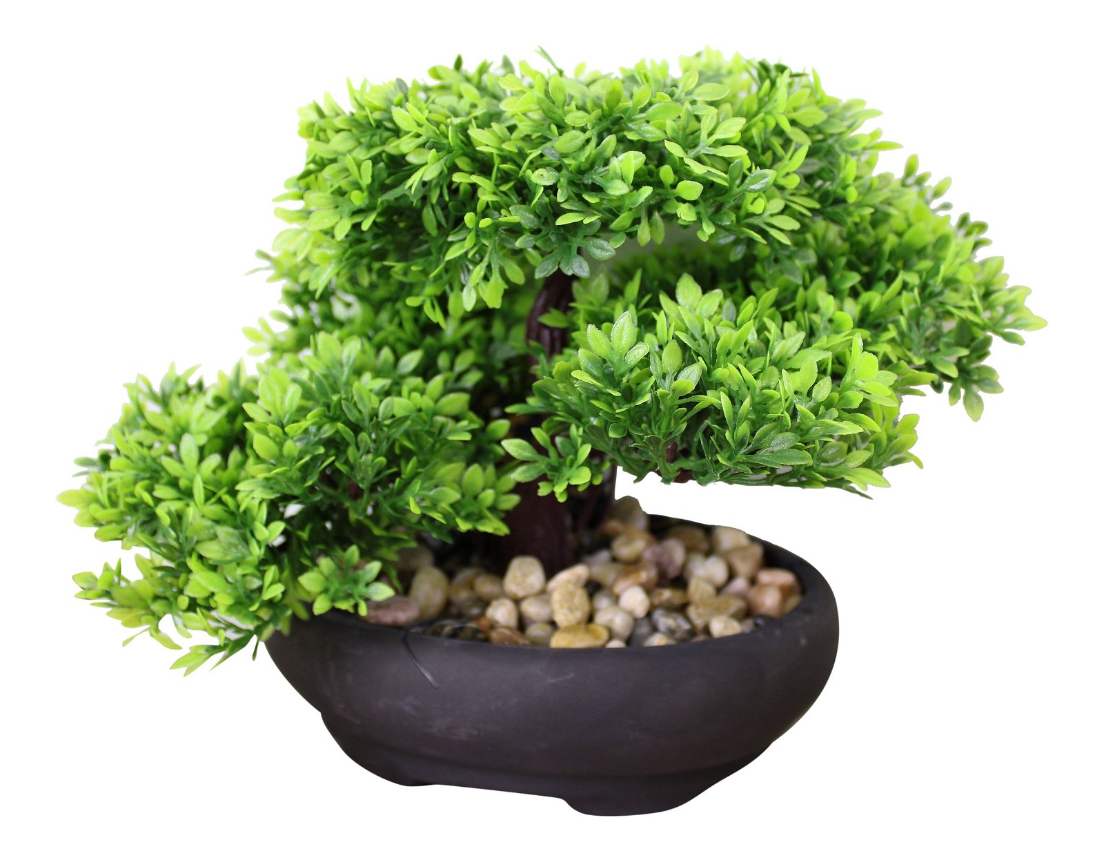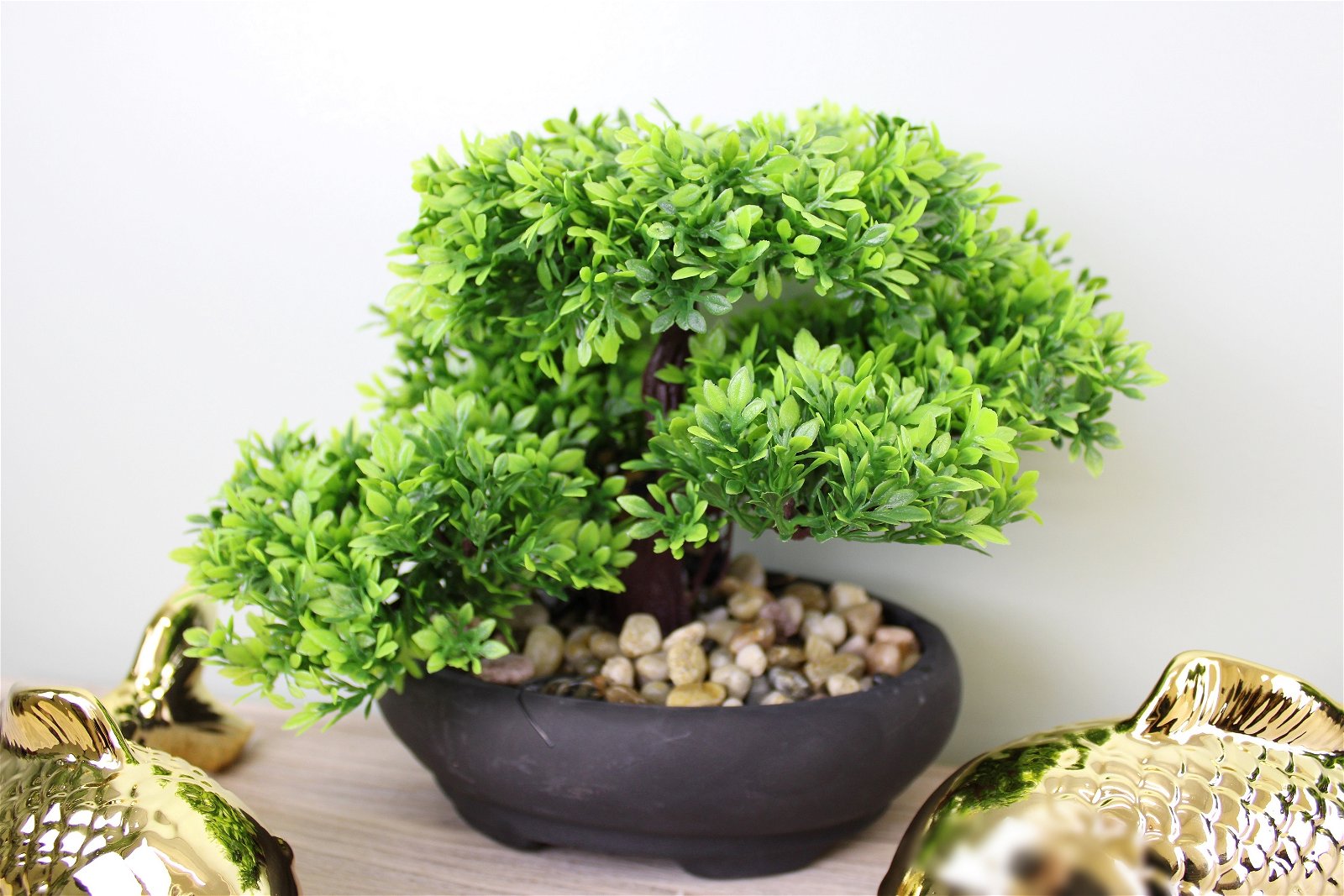 Eastern Faux Bonsai Tree in Boxwood Style Give your home a touch of oriental flair with these small but perfectly formed faux bonsai. MATERIAL COMPOSITION 70%PE, 10% stone, 10%FOAM , 10%terracotta Measurements: 26 x 16 x 17cm SKU: TJNE0029