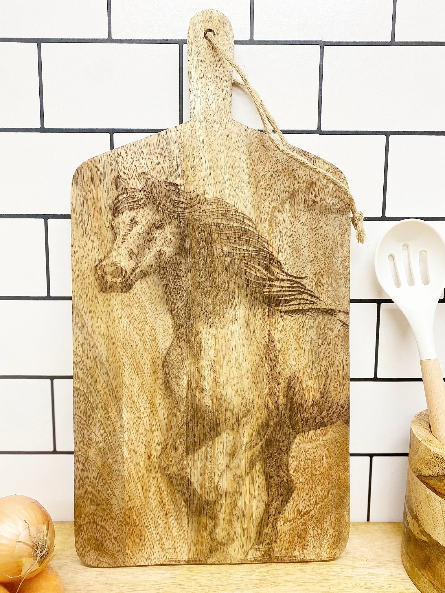 Natural wood chopping board with a striking engraved portrait of a horse, with a jute string loop. A striking piece that would grace any home. The board is 50cm long including the handle, the main body of the board is 36cm long with the engraved portait of the horse covering the majority of the board. Measurements: D25 x H2 x W50cm