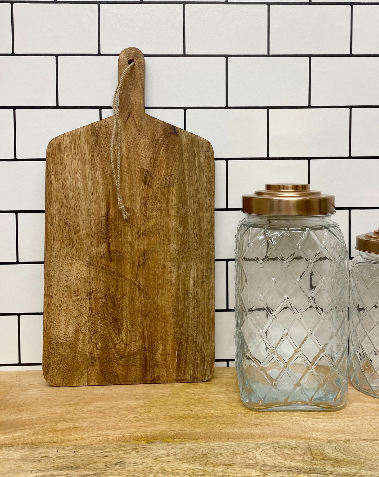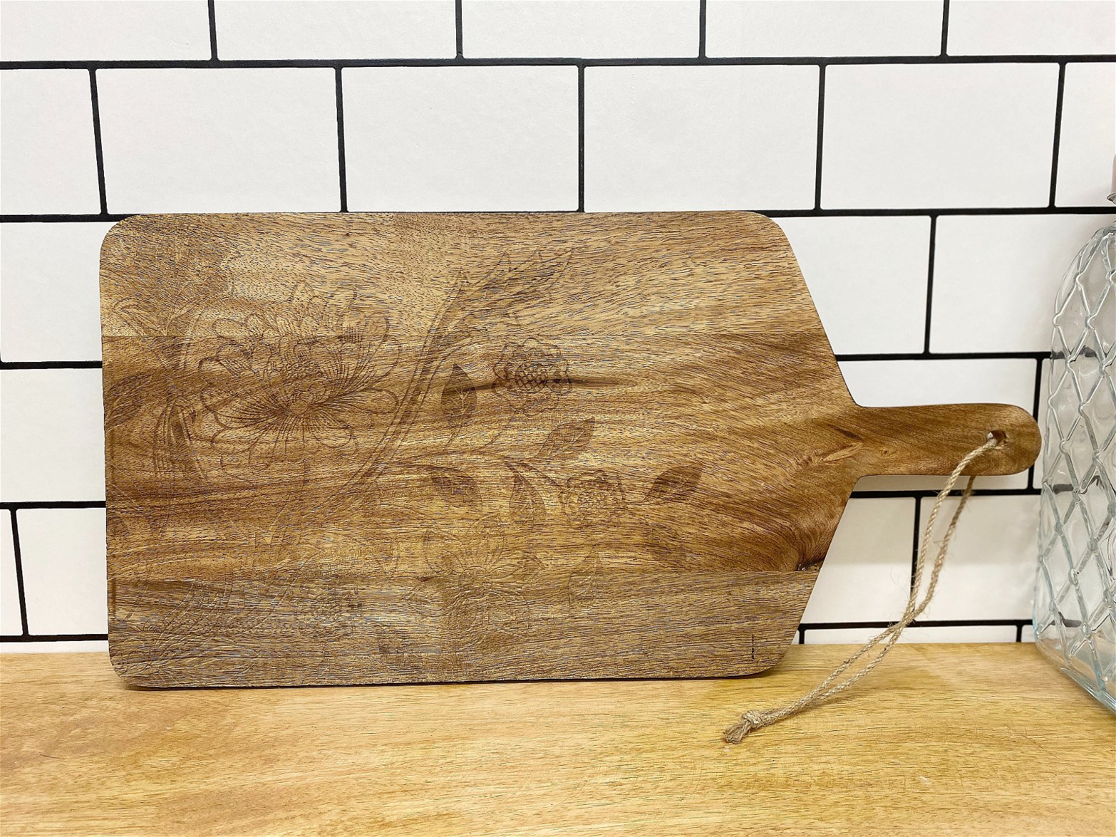 A solid wood chopping board decorated with a floral etching is very attractive and obviously useful. The total length is 50cm with the handle of 9 cm. The width is 25cm and the depth is 1.5cm. Measurements: D1.5 x H25 x W50cm