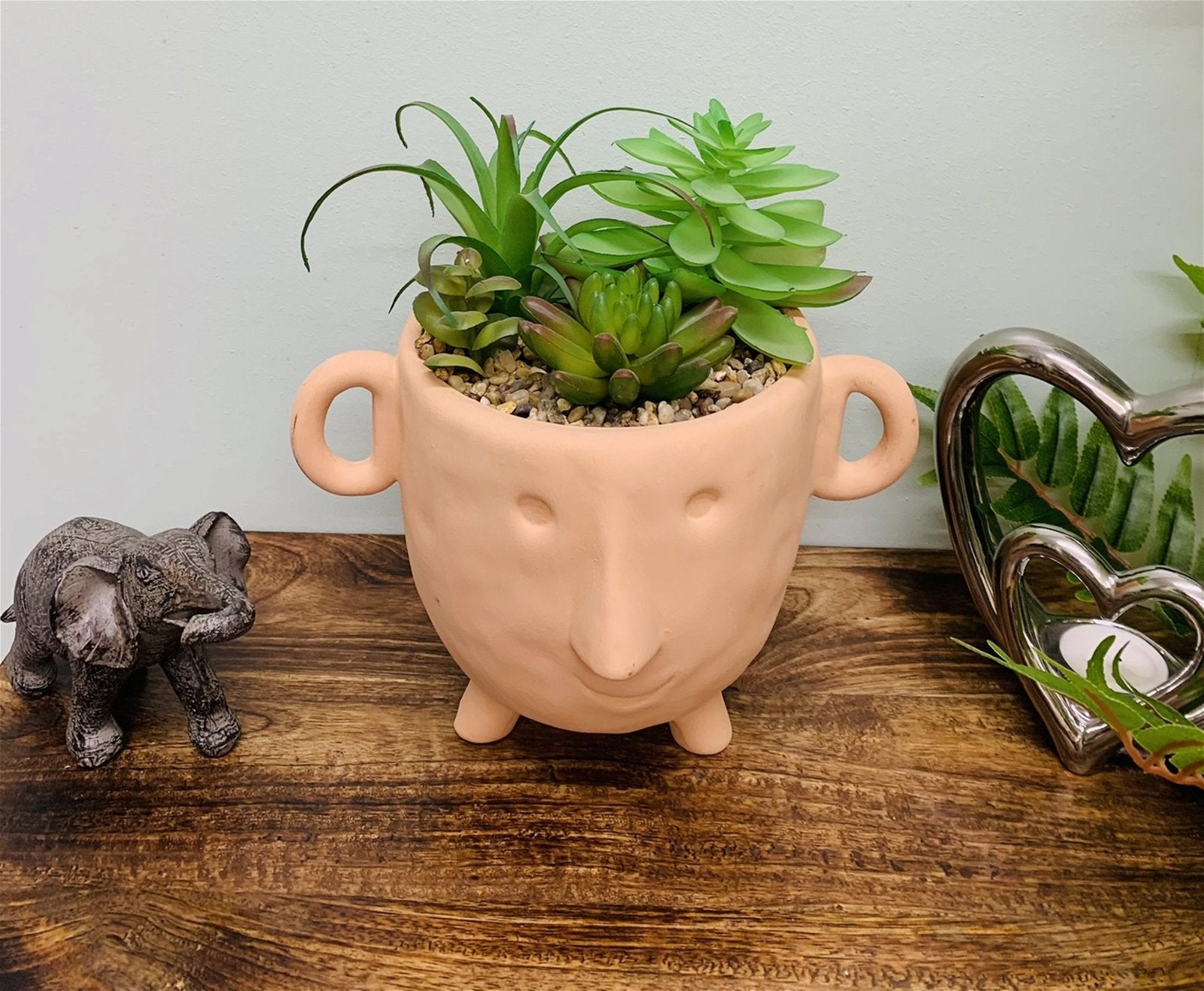 This quirky handmade terracotta pot with face detail and ear handles contains four faux cacti plants. Comes adorned with an artificial succulent plant and gravel bedding. Measurements: D19 x H27 x W22cm SKU: OR1606